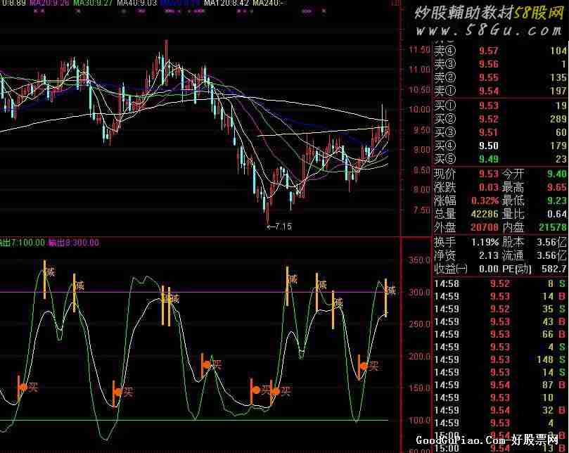 V1:=POW(MA(CLOSE,5),2)+MA(CLOSE,5); V2:=POW(MA(LOW,5),2)+MA(LOW,5); V3:=POW(MA(HIGH,5),2)+MA(HIGH,5); V4:=(V1-LLV(V2,9))/(HHV(V3,9)-LLV(V2,9))*150+65; DK:SMA(V4,3,1)*1.5,COLORFFFFFF; DD:=SMA(DK,3,1); DJ:3*DK-2*DD,COLORGREEN; L1:=(EMA(CLOSE,3) - EMA(CLOSE,13)); L2:=EMA(L1,9); L3:=BARSLAST(CROSS(L1,L2)); L4:=REF(L3,L3+1); L5:=L2<REF(L2,L4); 变盘:=CROSS(L1,L2) AND L5; DRAWTEXT( 变盘>0,DK+20,'●买'),COLOR005BF5; STICKLINE( 变盘>0,DK,DK+40,2,0),COLOR005BF5; W1:= EMA(CLOSE,12) - EMA(CLOSE,26); W2:= EMA(W1,9); W3:= 2*(W1-W2); W4:= REF(W3,1); W5:= CROSS(W4,W3) AND W4>0; DRAWTEXT(W5 AND DJ>250,DJ,'减'),COLOR00B4FF; STICKLINE(W5 AND DJ>250,DJ+20,DJ-40,2,0),COLOR00B4FF; 100,COLOR00FF00; 300,COLORFF00F8;