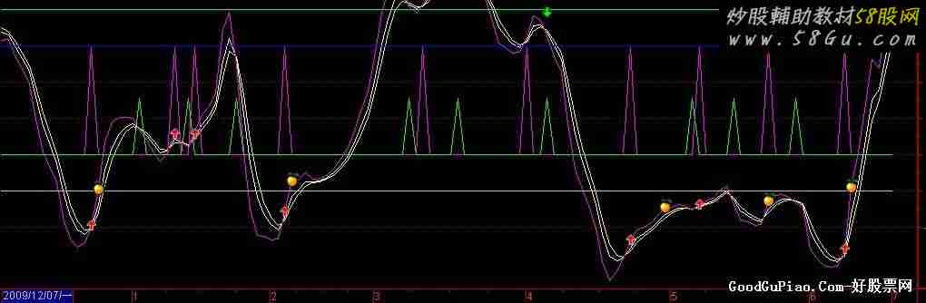 VAR2:=(HIGH+LOW+CLOSE*2)/4; VAR3:=EMA(VAR2,21); VAR4:=STD(VAR2,21); VAR5:=((VAR2-VAR3)/VAR4*100+200)/4; VAR6:=(EMA(VAR5,5)-25)*1.56; AK: EMA(VAR6,2)*1.22; AD1: EMA(AK,2); AJ: 3*AK-2*AD1; AA:100; BB:0; CC:80; 买进: IF(CROSS(AK,AD1),79,20),COLORMAGENTA; 卖出: IF(CROSS(AD1,AK),51,20),COLORGREEN;DRAWICON(CROSS(AD1,AJ) AND AD1>75.26,AD1*1.1,2); DRAWICON(CROSS(AJ,AD1) AND AJ<80,AJ*0.96,1); DRAWICON(CROSS(AJ,-10.64),AJ*0.96,17);