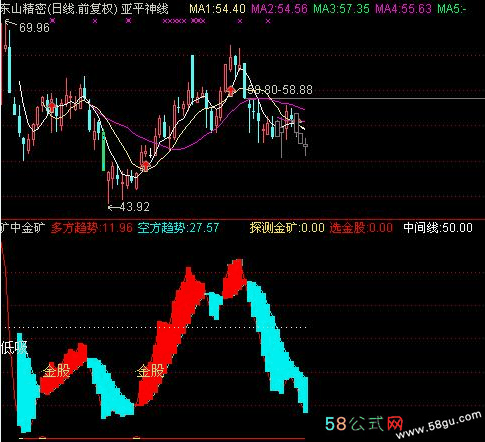 多方趋势:((7)*(SMA(((CLOSE-LLV (LOW,27))/(HHV(HIGH,27)-LLV(LOW,27)))*(30),4,1))-(3)*(SMA(SMA(((CLOSE-LLV(LOW,27))/(HHV(HIGH,27)-LLV(LOW,27)))*(30),4,1),3,1))-SMA(SMA(SMA(((CLOSE-LLV(LOW,27))/(HHV(HIGH,27)-LLV(LOW,27)))*(30),4,1),3,1),2,1)),COLOR0000FF; 空方趋势:(EMA(MA(多方趋势,5),7)),COLORF0F000; STICKLINE((多方趋势>78) AND (多方趋势>=空方趋势),78,多方趋势,5,1),COLOR00FF00; STICKLINE((空方趋势<=多方趋势),空方趋势,多方趋势,3,0),COLOR0000FF; STICKLINE((空方趋势>多方趋势),多方趋势,空方趋势,3,0),COLORF0F000; STICKLINE((空方趋势<14) AND (空方趋势>多方趋势),多方趋势,20,3,0),COLOR00FFFF; TJ:=FILTER((空方趋势<14) AND (空方趋势>多方趋势),6); DRAWTEXT(TJ,40,'低吸'),COLORFFFFFF; 探测金矿:(空方趋势<12) AND (空方趋势<=多方趋势),COLOR00FFFF; 选金股:CROSS(多方趋势,空方趋势) AND (空方趋势<22),COLOR0000FF; DRAWTEXT(CROSS(多方趋势,空方趋势) AND (空方趋势<22),30,'金股'),COLOR00FFFF; 中间线:50,COLORFFFFFF,POINTDOT;