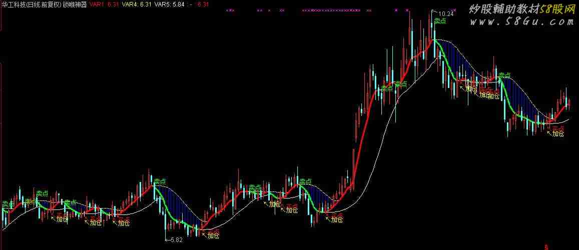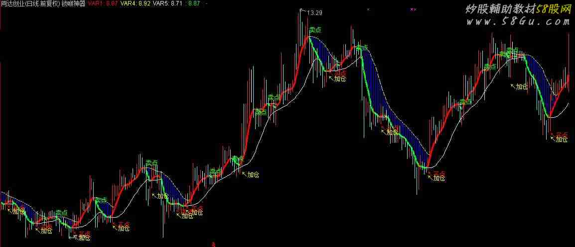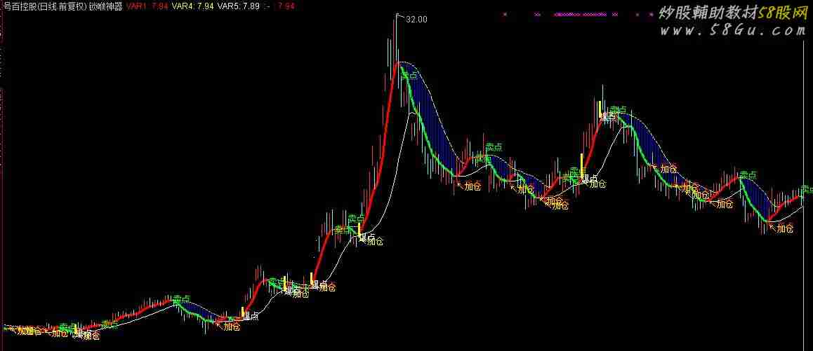 通达信锁喉神器,波段为王趋势指标,顶底神奇 这是个傻瓜式的操盘方法 1、出现白线就介入 2、出现黄线就卖出{锁喉神器}AAA:=(3*C+H+L+O)/6;VAR1:(8*AAA+7*REF(AAA,1)+6*REF(AAA,2)+5*REF(AAA,3)+4*REF(AAA,4)+3*REF(AAA,5)+2*REF(AAA,6)+REF(AAA,8))/36,LINETHICK2,COLORRED;VAR2:=(HHV(VAR1,2)+HHV(VAR1,4)+HHV(VAR1,8))/3;VAR3:=(LLV(VAR1,2)+LLV(VAR1,4)+LLV(VAR1,8))/3;VAR4:(HHV(VAR2,2)+HHV(VAR2,4)+HHV(VAR2,8))/3;VAR5:(LLV(VAR3,2)+LLV(VAR3,4)+LLV(VAR3,8))/3,COLORWHITE;VAR6:=(LLV(VAR1,2)+LLV(VAR1,4)+LLV(VAR1,8))/3;{DRAWBAND(VAR1,RGB(155,50,50),VAR6,RGB(250,250,0));}IF((VAR1 <= REF(VAR1,1)),VAR1,DRAWNULL),COLORGREEN,LINETHICK3;IF((VAR1 >= REF(VAR1,1)),VAR1,DRAWNULL),COLORRED,LINETHICK3;STICKLINE(VAR4>VAR1,VAR4,VAR1,0,0),COLORBLUE;DRAWKLINE(H,O,L,C);DRAWTEXT(REF(VAR5,1)=REF(VAR1,1) AND VAR5<VAR1,L*0.99,'↖买点'),COLORRED;DRAWTEXT(REF(VAR6,1)=REF(VAR1,1) AND VAR6<VAR1,L*0.98,'↖加仓'),COLORYELLOW;DRAWTEXT(REF(VAR4,1)=REF(VAR1,1) AND VAR4>VAR1,H,'卖点'),COLORGREEN;ZT:=REF(C,1)*1.1-C<0.01 AND H=C;{涨停};突破:=CROSS(C,VAR4) AND ZT;DRAWTEXT(突破,L,'爆点');STICKLINE(突破,CLOSE,OPEN,3.2,0),COLOR0077FF;STICKLINE(突破,CLOSE,OPEN,2.5,0),COLOR0099FF;STICKLINE(突破,CLOSE,OPEN,1.9,0),COLOR00BBFF;STICKLINE(突破,CLOSE,OPEN,1.2,0),COLOR00DDFF;STICKLINE(突破,CLOSE,OPEN,0.3,0),COLOR00FFFF;    |
