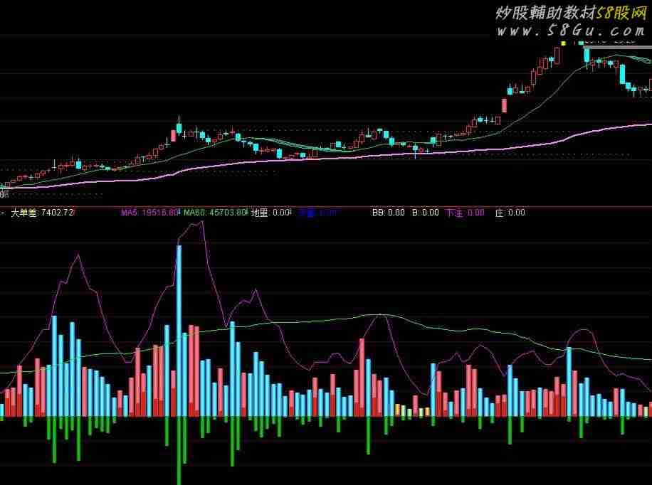TOTAL:=IF(PERIOD=1,5,IF(PERIOD=2,15,IF(PERIOD=3,30,IF(PERIOD=4,60,IF(PERIOD=5,TOTALFZNUM,1)))));MTIME:=MOD(FROMOPEN,TOTAL);CTIME:=IF(MTIME<0.5,TOTAL,MTIME);VVOL:IF(CURRBARSCOUNT=1,VOL*TOTAL/CTIME,DRAWNULL),NODRAW;STICKLINE(CURRBARSCOUNT=1,VVOL,0,-1,-1),COLOR00C0C0;JJ:=(HIGH+LOW+CLOSE)/3;QJ0:=VOL/IF(HIGH=LOW,4,HIGH-LOW);主买:=QJ0*IF(C<O,MIN(CLOSE,OPEN)-LOW,ABS(JJ-MIN(CLOSE,OPEN)));主卖:=QJ0*IF(C<O,(HIGH-JJ),(HIGH-MAX(OPEN,CLOSE)));V0:=VOL;大单差:(主买-主卖),LINETHICK;STICKLINE(大单差>=0,0,V0,3,0),COLOR2222CC;STICKLINE(大单差>=0,0,V0,2.5,0),COLOR3333DD;STICKLINE(大单差>=0,0,V0,2,0),COLOR4444DD;STICKLINE(大单差>=0,0,V0,1.5,0),COLOR5555EE;STICKLINE(大单差>=0,0,V0,1,0),COLOR6666EE;STICKLINE(大单差>=0,0,V0,0.5,0),COLOR9977EE;STICKLINE(大单差<0,0,V0,3,0),COLORFF7700;STICKLINE(大单差<0,0,V0,2.5,0),COLORFF8811; STICKLINE(大单差<0,0,V0,2,0),COLORFFAA22;STICKLINE(大单差<0,0,V0,1.5,0),COLORFFBB33; STICKLINE(大单差<0,0,V0,1,0),COLORFFDD44; STICKLINE(大单差<0,0,V0,0.5,0),COLORFFFF55;MA5:MA(VOL,5)*2;MA60:MA(VOL,60)*2;AA:=SUMBARS(VOL,CAPITAL);地量:IF(CAPITAL=0,AMOUNT=LLV(AMOUNT,34),VOL<MA(VOL,AA)/3) ,LINETHICK0;STICKLINE(地量,VOL,0,1,0),COLORYELLOW;天量:IF(CAPITAL=0,AMOUNT=HHV(AMOUNT,34),VOL>MA(VOL,AA)*3) ,LINETHICK0,COLORFF0000;STICKLINE(天量,VOL,0,1,0),COLORFF0000;STICKLINE(大单差>0,0,大单差,2,0),COLOR102088;STICKLINE(大单差>0,0,大单差,1.5,0),COLOR1020BB;STICKLINE(大单差>0,0,大单差,1,0),COLOR1020DD;STICKLINE(大单差>0,0,大单差,0.5,0),COLOR1020EE;STICKLINE(大单差<0,0,大单差,2,0),COLOR007700;STICKLINE(大单差<0,0,大单差,1.5,0),COLOR008800; STICKLINE(大单差<0,0,大单差,1,0),COLOR00AA00; STICKLINE(大单差<0,0,大单差,0.5,0),COLOR00CC00;BB:IF(CROSS(0.9,1/VOL*10000>0.01 AND "KDJ.J"<0),VOL*5,0) AND 大单差>0,LINETHICK0;STICKLINE(BB<0,0,100,1,0),COLORYELLOW,POINTDOT;RSV:=(CLOSE-LLV(LOW,18))/(HHV(HIGH,18)-LLV(LOW,18))*100;K:=SMA(RSV,5,1);D:=SMA(K,3,1);J:=(3*K-2*D);M:=EMA(J,3);E:=EMA(M,3);A1:=BARSLAST(REF(CROSS(M,E),1));底背离:=REF(L,A1+1)>L AND M>REF(M,A1+1) AND CROSS(M,E) AND M<20;B:底背离,LINETHICK0;STICKLINE(B,0,100,1,0),COLOR00CC00;X:=LLV(J,2)=LLV(J,8);VAR1:=LLV(LOW,10);VAR2:=HHV(HIGH,25);VAR3:=100*EMA((CLOSE-VAR1)/(VAR2-VAR1),4);下注:CROSS(J,REF(J+0.01,1)) AND X AND J<0,LINETHICK0;STICKLINE(下注,0,100,1,0),COLORRED,POINTDOT;DRAWTEXT(下注,0,'注'),COLORRED;S:=EMA((CLOSE-LLV(CLOSE,21))/(HHV(CLOSE,21)-LLV(CLOSE,21)),1);Y:=IF(S>0,MA(S,1),0);庄:CROSS(Y,REF(Y+0.001,1)) AND J<0,LINETHICK0,COLORFF22AA;DRAWTEXT(庄,0,'买'),COLORFF22AA;STICKLINE(庄,0,100,1,0),COLORFF22AA; |