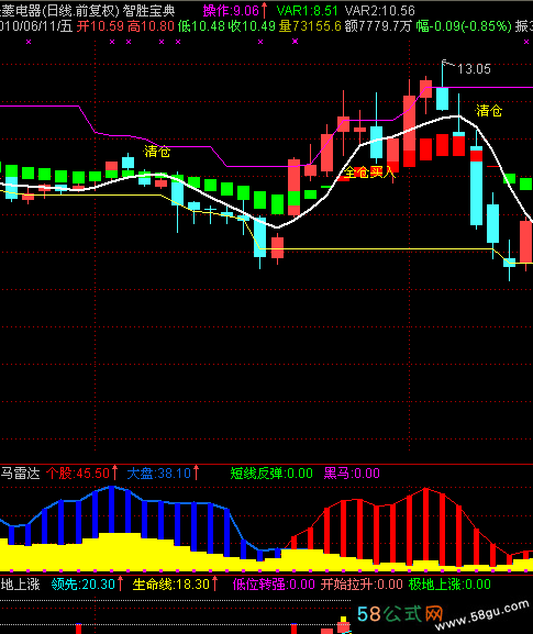 上线:=SMA(C,6.5,1); 下线:=SMA(C,13.5,1); 上线界:=SMA(C,3,1); 下线界:=SMA(C,8,1); STICKLINE(上线>下线 , 上线,下线 ,2.5, 0),COLORRED,LINETHICK2; STICKLINE(下线>上线,上线,下线,2.5,0),COLORGREEN,LINETHICK2; DRAWTEXT( CROSS(上线,下线),LOW *0.98,'全仓买入' ),COLORYELLOW; DRAWTEXT(CROSS(下线界,上线界),H*1.02,'清仓'),COLORYELLOW; BBI:=(MA(CLOSE,3)+MA(CLOSE,6)+MA(CLOSE,12)+MA(CLOSE,24))/4; UPR:=BBI+3*STD(BBI,13); DWN:=BBI-3*STD(BBI,13); 安全:=MA(CLOSE,60); LC:=REF(CLOSE,1); RSI:=SMA(MAX(CLOSE-LC,0),6,1)/SMA(ABS(CLOSE-LC),6,1)*100;A7:=(2*C+H+L)/4; 操作:MA(A7,5),LINETHICK2; 操作界:=MA(A7,5)*1.03; 操作界限:=MA(A7,5)*0.97; VAR1:LLV(A7,21); VAR2:HHV(A7,21); SK:=EMA((A7-VAR1)/(VAR2-VAR1)*100,7); SD:=EMA(0.667*REF(SK,1)+0.333*SK,5); DRAWTEXT(IF(COUNT(CLOSE<REF(CLOSE,1),8)/8>6/10 AND VOL>=1.5*MA(VOL,5) AND COUNT(SK>=SD,3) AND REF(LOW,1)=LLV(LOW,120),1,0),LOW*0.98,'买进') ,COLOR0099FF; DRAWTEXT(IF(COUNT(CLOSE<REF(CLOSE,1),13)/13>6/10 AND COUNT(SK>SD,6) AND REF(LOW,5)=LLV(LOW,120) AND REF(CLOSE>=OPEN,4) AND REF(CLOSE>OPEN,3) AND REF(CLOSE>OPEN,2) AND REF(OPEN>CLOSE,1) AND OPEN>REF(CLOSE,1),1,0),LOW*0.98,'买进') ,COLORYELLOW; D:=MA(CLOSE,80)-MA(CLOSE,10)/3; DRAWTEXT(IF(CLOSE<D AND VOL/240>MA(VOL,5)/240 AND CLOSE>REF(CLOSE,1)*1.08 AND CLOSE<MA(CLOSE,13)*1.3,1,0),LOW*0.98,'抄底'),COLORYELLOW; |