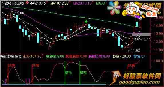 N:=5; 走势:4*SMA((CLOSE-LLV(LOW,N))/(HHV(HIGH,N)-LLV(LOW,N))*100,5,1)- 3*SMA(SMA((CLOSE-LLV(LOW,N))/(HHV(HIGH,N)-LLV(LOW,N))*100,5,1),3.2,1),COLOR0099FF,LINETHICK1; 底部线:8,COLORGREEN,LINETHICK1; 脱离底部: IF(CROSS(走势,底部线),78,0),STICK,COLORRED,LINETHICK2; 底部区域: IF(走势<=8,25,0),STICK,COLORMAGENTA,LINETHICK2; DRAWTEXT(CROSS(走势,底部线),80,'抄底'),COLORRED; 抄底点: IF(CROSS(走势,0),38,0),STICK,COLORYELLOW,LINETHICK2; DRAWTEXT(CROSS(走势,0),50,'抄底'),COLORYELLOW; 零轴:0,LINETHICK2,COLORFFCC00; A01:=(C-LLV(LOW,3))/(HHV(HIGH,3)-LLV(LOW,3)); A11:=SMA(A01,2,1); A21:=SMA(A11,2,1); A31:=3*A11-2*A21 ; A41:=2*A31-0.5; 生命线:=C*(1-(A41-A21)/15); 风险线:100,COLORLIRED,LINETHICK1; 避险点1: IF(CROSS(100,走势),100,0),STICK,COLORGREEN,LINETHICK2; 避险点2: IF(CROSS(88,走势),100,0),STICK,COLORGREEN,LINETHICK2; DRAWTEXT(CROSS(88,走势) AND C<生命线,50,'避险'),COLORGREEN; DRAWTEXT(CROSS(100,走势) AND C<生命线,50,'避险'),COLORGREEN; B:=走势<REF(走势,1); IF(B-1,走势,DRAWNULL)COLORRED,LINETHICK1; |