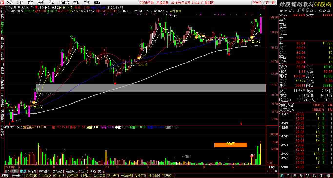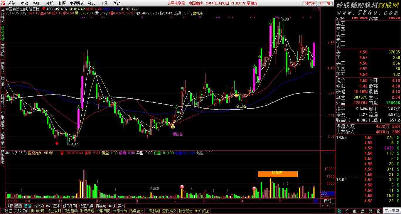 自用的K线叠加公式,源于网络,自己有点小改动,分享给大家。公式只是参考,直观地呈现出来。应用就看个人了。 例子为5月30日收盘涨幅前几位的,供大家参考。M5:MA(C,5),COLORWHITE; M10:MA(C,10),COLORYELLOW;M30:MA(C,30),COLORRED; M60:MA(C,60),COLORBLUE;M120:MA(C,120),LINETHICK2,COLORLIGRAY; 山谷:=MA(C,5)>MA(C,10) AND MA(C,10)>MA(C,30) AND CROSS(MA(C,10),MA(C,30)); DRAWTEXT(山谷 AND MA(C,5)<MA(C,120),MA(C,30)-0.18,'银山谷'),COLORMAGENTA; DRAWICON(FILTER(山谷 AND MA(C,5)<MA(C,120),MA(C,30)),L,9);DRAWTEXT(山谷 AND MA(C,30)>MA(C,120),MA(C,30)-0.18,'金山谷'),COLORYELLOW; DRAWICON(FILTER(山谷 AND MA(C,30)>MA(C,120),MA(C,30)),L,26);CM:=REF(C,1); 涨停:=IF((C-CM)*100/CM>=9.9,1,0); STICKLINE(涨停,OPEN,CLOSE,3.8,0),COLORMAGENTA; STICKLINE(涨停,H,L,0,0),COLORLIRED; 跌停:=IF((C-CM)*100/CM<=-9.9,1,0); STICKLINE(跌停,OPEN,CLOSE,3.8,0),COLORGREEN; STICKLINE(跌停,H,L,0,0),COLORGREEN;    |