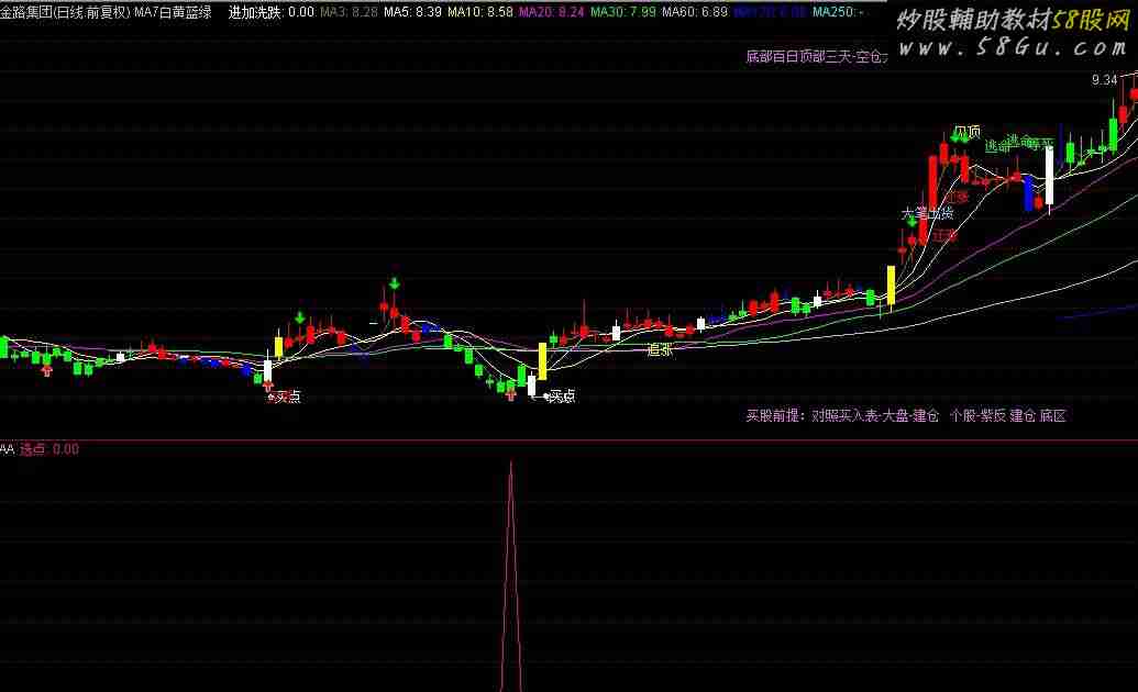 SM01:=MA((2*C+H+L)/4,5); SM02:=SM01*(200-102)/100; SM03:=(1-7/100)*DMA(C,ABS((2*C+H+L)/4-MA(C,20))/MA(C,20)); SM04:=(C-LLV(L,9))/(HHV(H,9)-LLV(L,9))*100; SM05:=3*SMA(SM04,3,1)-2*SMA(SMA(SM04,3,1),3,1); SM06:=((H+L+C)/3-MA((H+L+C)/3,14))/(0.015*AVEDEV((H+L+C)/3,14)); SM07:=SM02<SM03&&SM05>REF(SM05,1)&&REF(SM05,1)<REF(SM05,2)&&SM06<-100 &&SM06>REF(SM06,1); AA:=STICKLINE(SM07,0,0.5,2,0),COLORYELLOW; 买点:=SM07,COLORRED,LINETHICK3; 选点:30*(SS1 AND 买点),COLORLIMAGENTA;