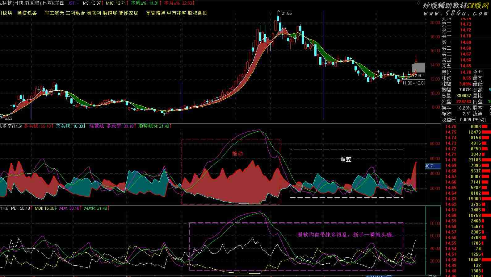 适用于新股民--多空指标这个多空指标源于DMI指标修改,做波段稳定老股民都视它为“宝贝”。原指标由于有四条线,线多很乱,一看就头痛,通过修改填色一目了然,指标里加上释义,新股民很容易记住了。 看DMI指标要点 1、“抓住“多头”“空头”在上还是在下”;这是分辨“多头”和“空头”市场的一个依据。 2、看多头和空头的“金叉、死叉”,以及顺势线的“金叉、死叉”,这是判断“变盘”的一个依据。 ============================================================================================ {副图名称:多空指标} {参数设置:N(2,90,14);MM(2,60,6)}