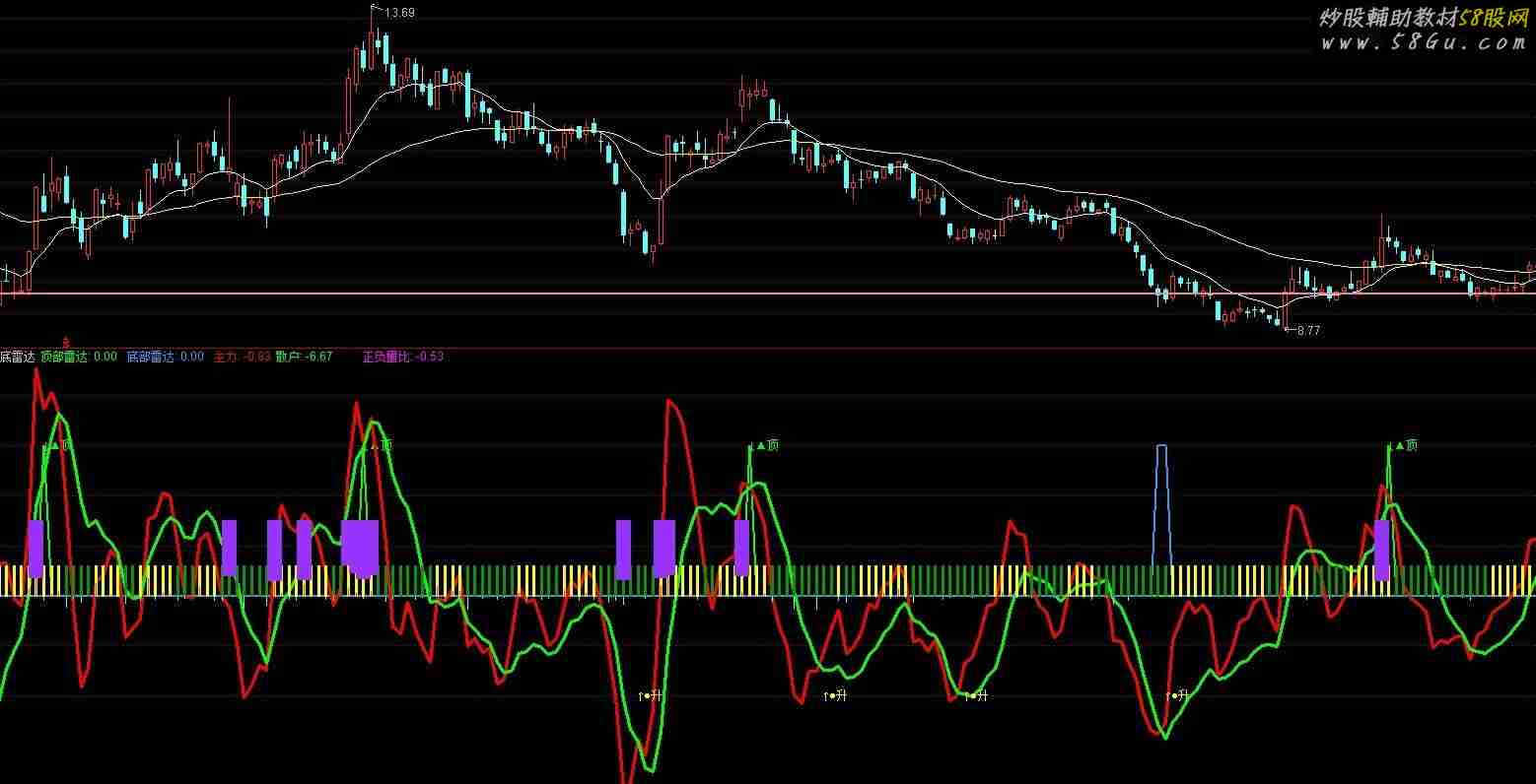 {顶底雷达}LC:=REF(CLOSE,1);RSI:=SMA(MAX(CLOSE-LC,0),6,1)/SMA(ABS(CLOSE-LC),6,1)*100;顶部雷达:CROSS(80,RSI)*30,LINETHICK2 ,COLORGREEN;DRAWTEXT(CROSS(80,RSI),30,'↓▲顶 '),COLORGREEN;VARB:=SMA(MAX(CLOSE-LC,0),7,1)/SMA(ABS(CLOSE-LC),7,1)*100;VARC:=SMA(MAX(CLOSE-LC,0),13,1)/SMA(ABS(CLOSE-LC),13,1)*100;VARD:=BARSCOUNT(CLOSE);底部雷达:(VARB< 20 AND VARC< 25 AND VARD> 50)*30,LINETHICK2, COLORFF9933;DRAWTEXT(CROSS(100,底部雷达) ,20,'底 '),LINETHICK1,COLORF00FF0;主力:EMA( (CLOSE-MA(CLOSE,7))/MA(CLOSE,7)*480,2),LINETHICK3 ,COLORRED;散户:EMA( (CLOSE-MA(CLOSE,11))/MA(CLOSE,11)*480,7),LINETHICK3 ,COLORGREEN;DRAWTEXT(CROSS(主力,散户) AND 主力<-10,-20,'↑●升'),COLORYELLOW; DRAWICON(CROSS(主力,散户) AND 主力<-10 AND 散户>REF(散户,1)OR CROSS(主力,散户) AND 散户<-35 ,-15,1);DRAWTEXT(CROSS(18,RSI)AND 散户<-20 AND 底部雷达 ,25,'底 '),LINETHICK1, COLORF00FF0;MAV:=(2*C+H+L)/4;VAR1:=LLV(LOW,4);VAR2:=HHV(HIGH,7);SK:=EMA((MAV-VAR1)/(VAR2-VAR1)*100,13);SD:=EMA(0.667*REF(SK,1)+0.333*SK,2);持仓:STICKLINE(SK> SD,6,0,1,0) ,LINETHICK3, COLORYELLOW;空仓:STICKLINE(SK< SD,6,0,1,0) ,LINETHICK3, COLOR009900;正负量比:12*(WINNER(C)-WINNER(O)) ,LINETHICK2 ,COLORSTICK;时空分裂点:STICKLINE(100*V/CAPITAL>= 3 AND 100*V/CAPITAL<7,100*V/CAPITAL,15,7,0),LINETHICK2, COLORFF3399;STICKLINE(100*V/CAPITAL>= 7,100*V/CAPITAL,6,2,0),LINETHICK2 ,COLORRED; |