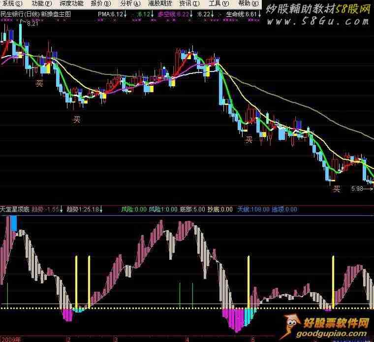 趋势:5*SMA((CLOSE-LLV(LOW,27))/(HHV(HIGH,27)-LLV(LOW,27))*100,5,1) -3*SMA(SMA((CLOSE-LLV(LOW,27))/(HHV(HIGH,27)-LLV(LOW,27))*100,5,1),3,1) -SMA(SMA(SMA((CLOSE-LLV(LOW,27))/(HHV(HIGH,27)-LLV(LOW,27))*100,5,1) ,3,1),2,1),COLOR7F52AF; 趋势1:EMA(MA(趋势,5),3),COLORA6B8C1; STICKLINE(趋势>=趋势1,趋势,趋势1,2,0),COLOR7F52AF; STICKLINE(趋势<趋势1,趋势,趋势1,2,0),COLORA6B8C1; STICKLINE(趋势>108 AND 趋势>=趋势1,趋势,108,2,0),COLORBLUE ; STICKLINE(趋势1>108 AND 趋势<趋势1,趋势1,108,2,0),COLORWHITE; STICKLINE(趋势<0 AND 趋势<趋势1,趋势,0,2,0),COLORF00FF0 ; STICKLINE(趋势1<0 AND 趋势>趋势1,趋势1,0,2,0),COLORF0F000; V1:=MA(C,5)=HHV(MA(C,5),20); V2:=MA(C,5)>MA(C,20); V3:=COUNT(MA(C,1)>REF(C,1),3)=3; 风险:IF(V1 AND V2 AND V3,30,0),STICK,COLOR00FF00; V11:=MA(C,5)=HHV(MA(C,5),120); V21:=MA(C,5)>MA(C,120); V31:=COUNT(MA(C,1)>REF(C,1),3)=3; 风险1:IF(V11 AND V21 AND V31,60,0),STICK,COLORF0F000; 底部:5; 抄底:IF(CROSS(趋势,底部),60,0),STICK,COLORYELLOW,LINETHICK4; DRAWTEXT(抄底,50,'抄底'),COLORRED; 天线:108,COLORFF9D00; 逃顶:IF(CROSS(天线,趋势),1,0),STICK,COLORFF9D00; STICKLINE(CROSS(天线,趋势),90,108,6,0),COLORFF9D00;