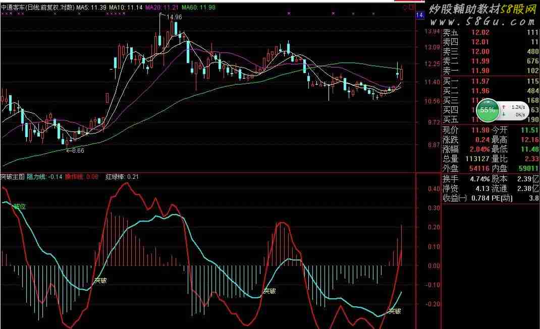 N:=19; VAR1:=HHV(HIGH,N); VAR2:=LLV(LOW,N); 阻力线:EMA((CLOSE-VAR2)/(VAR1-VAR2),21)-0.5,COLORF0F000,LINETHICK2; 操作线:EMA((CLOSE-VAR2)/(VAR1-VAR2),5)-0.5,COLORRED,LINETHICK2; DRAWTEXT(CROSS(操作线,阻力线) AND 阻力线<0.1,阻力线,'突破'),COLORYELLOW; DRAWTEXT(CROSS(阻力线,操作线) AND 阻力线>0.25,阻力线,'破位'),COLORGREEN; 红绿棒:(操作线-阻力线),COLORSTICK; |
