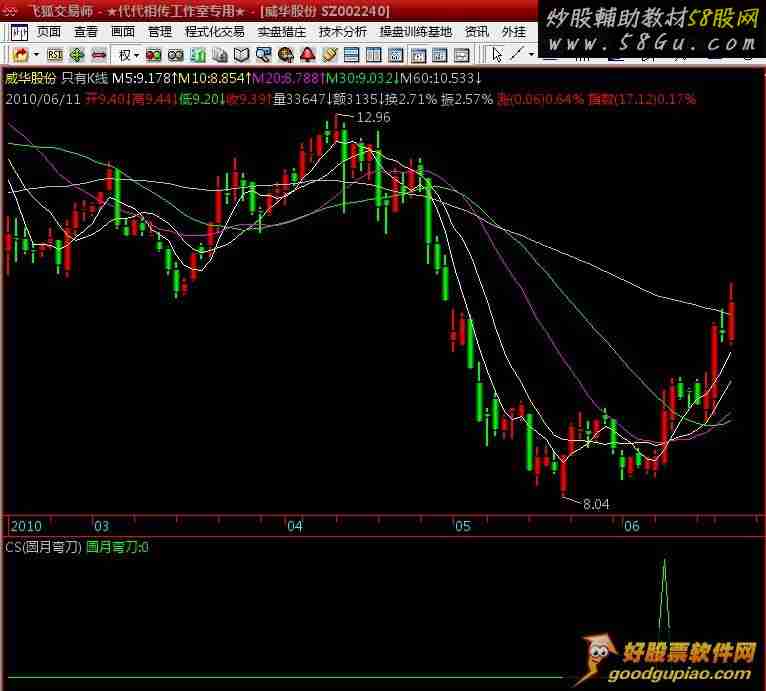 腰线:=(MA(CLOSE,3)+MA(CLOSE,6)+MA(CLOSE,12)+MA(CLOSE,24))/4,,; KKA:=EMA(C-L,5) ; 顶线:=MA((C+REF(C,1)+REF(C,1))/3+KKA,5); 底线:=MA(REF(C,1)-KKA,5); MA10:= MA(C,10); MA20:= MA(C,20); MA60:= MA(C,60); BBA:=MA(C,2); CCA:=MA(C,10); DDA:=MA(C,20); EEA:=EXIST(CROSS(BBA,CCA) AND CROSS(BBA,DDA),1);RV:=(CLOSE-LLV(LOW,27))/(HHV(HIGH,27)-LLV(LOW,27))*100; RG:=(CLOSE-LLV(LOW,5))/(HHV(HIGH,5)-LLV(LOW,5))*100; J0:=(HIGH+LOW)/2; QJ:=EMA(J0,3); J1:=IF(CLOSE>QJ,VOL,0); J2:=IF(CLOSE<QJ,VOL,0); BB:=MA(SUM(J1-J2,22),3); 累加:=21*BB+20*REF(BB,1)+19*REF(BB,2)+18*REF(BB,3)+17*REF(BB,4) +16*REF(BB,5)+15*REF(BB,6)+14*REF(BB,7)+13*REF(BB,8)+12*REF (BB,9)+11*REF(BB,10)+10*REF(BB,11)+9*REF(BB,12)+8*REF(BB,13) +7*REF(BB,14)+6*REF(BB,15)+5*REF(BB,16)+4*REF(BB,17)+3*REF (BB,18)+2*REF(BB,19)+REF(BB,20); WMA1:=累加/(21+1)/21*2; CC:=WMA1; VAR3:=(BB-CC);VAR4:=SMA(RV,3,1); VAR5:=SMA(VAR4,3,1); KK:=EMA(SMA(RG,3,1),2),COLORFFFFFF; DD:=SMA(KK,3,1),COLOR00FFFF;圆月弯刀:腰线>O AND O>底线 AND C>顶线 AND C>MA20 AND C>腰线 AND EEA AND CROSS(VAR4,VAR5) AND CROSS(KK,DD)COLORGREEN;
