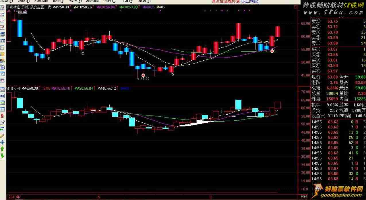 MA5:MA(C,5); (75,8)COLORRED; MA10:MA(C,10); MA20:MA(C,20); MA40:MA(C,40); MA60:MA(C,60); STICKLINE(MA5>=MA60 AND MA60>=MA10,MA10,MA60,4,0),COLORBLUE; STICKLINE(MA5>=MA10 AND MA5<=MA60,MA10,MA5,4,0),COLORBLUE; STICKLINE(MA20>=MA60 AND MA60>=MA40,MA40,MA60,4,0),COLORFF00FF; STICKLINE(MA20>=MA40 AND MA20<MA60,MA40,MA20,4,0),COLORFF00FF; STICKLINE(MA5>=MA20 AND MA20>=MA10,MA10,MA20,4,0),COLORWHITE; STICKLINE(MA5>=MA10 AND MA5<MA20,MA10,MA5,4,0),COLORWHITE; STICKLINE(C>=O,H,L,0,0),COLORRED; STICKLINE(C<O,H,L,0,0),COLORFFFF52; STICKLINE(C>=O,C,O,4,1),COLORRED; STICKLINE(C<O,C,O,4,0),COLORFFFF52;