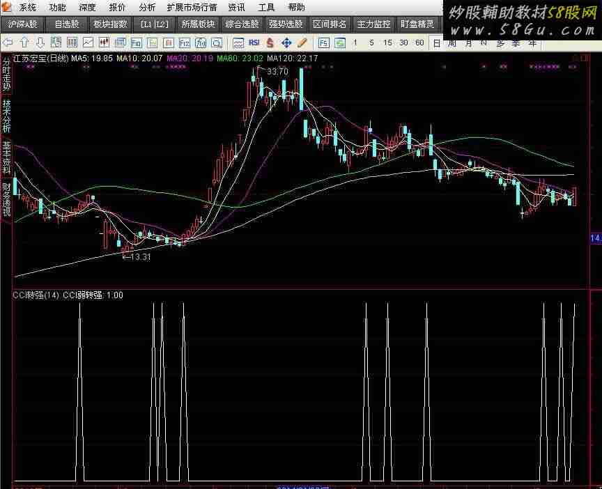 ++++++++++++++++++++++++ {N 2 100 14} TYP:=(HIGH+LOW+CLOSE)/3; CCI:=(TYP-MA(TYP,N))/(0.015*AVEDEV(TYP,N)); CCI弱转强:CROSS(CCI,1);