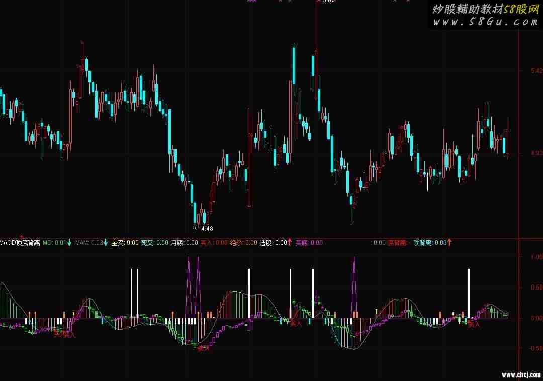 {变异MACD} V1:=EMA(SLOPE(C,21)+C,55); V2:=EMA(SLOPE(O,21)+O,55); V3:=EMA(SLOPE(H,21)+H,55); V4:=EMA(SLOPE(L,21)+L,55); V5:=EMA(C,3); V6:=EMA(O,3); V7:=EMA(H,3); V8:=EMA(L,3); V9:=V1-V5,; V10:=V2-V6,; V11:=V3-V7,; V12:=V4-V8,; ZC:=REVERSE(V9); ZO:=REVERSE(V10); ZH:=REVERSE(V11); ZL:=REVERSE(V12); DIF:=EMA(ZC*5,12)-EMA(ZC*5,26); DEA:=EMA(DIF,9{7}),COLORYELLOW,DOTLINE; MD:(DIF-DEA)*2,COLORSTICK,COLORLIGREEN; MAM:MA(MD,3),COLORGRAY; 金叉:CROSS(DIF,DEA),COLORYELLOW,NODRAW; 死叉:CROSS(DEA,DIF),COLORCYAN,NODRAW; 月底:C<=LLV(C,20),COLORLIGRAY,NODRAW; 启:=REF(MD,1)<REF(MD,2)AND MD>REF(MD,1)AND REF(MD<0,1); 买入:REF(ZC<=ZO,1)AND ZC>ZO AND 启=1,NODRAW,COLORRED; 绝杀:REF(月底=1,1)AND 月底=0 OR CROSS(C,COST(5)),COLOR0088FF,NODRAW; {近期可能涨停} DIF1:=EMA(C,6)-EMA(C,13); DEA1:=EMA(DIF1,5); QQ1:=(DIF1-DEA1)*2; 上:=IF(QQ1>REF(QQ1,1),QQ1,DRAWNULL); 主力:=QQ1-REF(QQ1,1),COLORRED; 选股:CROSS(QQ1,0) AND CROSS(主力,0) AND 主力/上>=1,NODRAW,COLORWHITE; R1:=(C-LLV(L,27))/(HHV(H,27)-LLV(L,27))*100; R2:=3*SMA(R1,5,1)-2*SMA(SMA(R1,5,1),3,1); 买底:IF(CROSS(R2,3),1,0),COLORMAGENTA; ZM3:=MA(ZC,3),COLORMAGENTA; ZM9:=MA(ZC,5),COLORGREEN; STICKLINE(MD>REF(MD,1) AND MD>0,0,MD,0,0),COLORRED; STICKLINE(MD<REF(MD,1) AND MD>0,0,MD,0,0),COLORGREEN; STICKLINE(MD>REF(MD,1) AND MD<0,0,MD,0,0),COLORLIRED; STICKLINE(MD<REF(MD,1) AND MD<0,0,MD,0,0),COLORCYAN; STICKLINE(金叉=1,MD,MD*2,0.1,0),COLORYELLOW; STICKLINE(死叉=1,0,-0.1,0.1,0),COLORCYAN; STICKLINE(ZC>ZO,ZH,ZL,0,0),COLORMAGENTA; STICKLINE(ZC>ZO,ZC,ZO,2.1,1),COLORMAGENTA; STICKLINE(ZC<=ZO,ZL,ZH,0,0),COLORGREEN; STICKLINE(ZC<=ZO,ZO,ZC,2.1,1),COLORGREEN; STICKLINE(买入=1,ZC,ZO,2.1,0),COLORRED; STICKLINE(买入=1,ZH,ZL,0,0),COLORRED; STICKLINE(MD>0 AND MD<REF(MD,1),0,MD,0,0),COLORLIGREEN; STICKLINE(MD<0 AND MD>REF(MD,1),0,MD,0,0),COLORLIRED; STICKLINE(选股=1,0,0.8,0.1,0),COLORWHITE; STICKLINE(月底=1,0,-0.1,0.1,0),COLORWHITE; DRAWTEXT(买入=1,MD-0.1,'买入'),COLORRED; STICKLINE(绝杀=1,0,0.1,0.1,0),COLOR0088FF; 0,COLORGRAY,DOTLINE; 底背离:IF(C<REF(C,1)AND MD>REF(MD,1),MAM,DRAWNULL),COLORRED; 顶背离:IF(C>REF(C,1)AND MD<REF(MD,1),MAM,DRAWNULL),COLORCYAN;