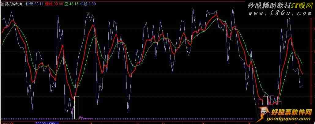 N:=9;M1:=3;M2:=3;P:=9; RSV:=(CLOSE-LLV(LOW,N))/(HHV(HIGH,N)-LLV(LOW,N))*100; K:=SMA(RSV,M1,1),COLORRED,LINETHICK2; D:=SMA(K,M2,1),COLOR00FF00; JJ:=P*(3*D-2*K),COLOR00FF00; J:=((3 * K) - (2 * D)); MAIRU:= CROSS(K,D) AND K<20; MAICHU:= CROSS(D,K) AND D>80; VAR2:=REF(LOW,1); VAR3:=SMA(ABS(LOW-VAR2),3,1)/SMA(MAX(LOW-VAR2,0),3,1)*100; VAR4:=EMA(IF(CLOSE*1.3,VAR3*10,VAR3/10),3); VAR5:=LLV(LOW,30); VAR6:=HHV(VAR4,30); VAR7:=IF(MA(CLOSE,58),1,0); VAR8:=EMA(IF(LOW<=VAR5,(VAR4+VAR6*2)/2,0),3)/618*VAR7; VAR9:=IF(VAR8>100,100,VAR8); 吸筹:STICKLINE(VAR9>-120,0,VAR9,6,1),COLORF00FF0; 快线:(CLOSE-LLV(LOW,N))/(HHV(HIGH,N)-LLV(LOW,N))*100,COLORFF937F; 慢线:SMA(快线,M1,1),COLORRED,LINETHICK2; 空:SMA(慢线,M2,1),COLOR00FF00; 牛股:IF(BARSLAST(CROSS(慢线,空))<P AND BARSLAST(CROSS(空,慢线))<P AND CROSS(慢线,空) AND 慢线<20,90,0),STICK,COLORFF937F; STICKLINE(牛股,0,90,6,1),LINETHICK4,STICK,COLORFF937F; BB:=IF(BARSLAST(CROSS(慢线,快线))>=3 AND CROSS(快线,慢线) AND 慢线<30,20,0); 买:STICKLINE(BB,0,20,7,1),COLORYELLOW; AA:=IF(BARSLAST(CROSS(快线,慢线))>=4 AND CROSS(慢线,快线) AND 快线>50,20,0); 卖:STICKLINE(AA,80,100,7,1),COLOR00FF00;