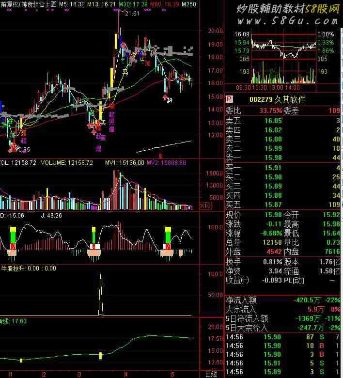 (本主题仅仅是提供一个楼主个人的选股思路,仅仅提供股市喜欢者探讨研究,据此入市风险自担!当然据此适当仓位参与而盈利者,能给赠送我点理想币奖励我也不反对,呵呵!) 附赠:精确买卖—波段操作指标,含指标、源码!请在图表中间下载即可。 精品用法:重点关注上升波段中回调时出现的信号,其余用法请大家细细体会。 {精确买卖}DIFF:=EMA(CLOSE,12) - EMA(CLOSE,26); {选股设JC=10即可}DEA:=EMA(DIFF,9);MACD:=2*(DIFF-DEA);A:=IF(CROSS(0,DEA),1,0);A1:=IF(DIFF<0 AND CROSS(DIFF,DEA),1,0);SS:=IF(A,SUM(A1,0),0);SSB:=HHV(SS,0);SSS:=SUM(A1,0);W底选股:IF(SSS-SSB=2 AND SSS>REF(SSS,1),-22,0),LINETHICK2,COLORFFFF00;IF(SSS-SSB=2 AND SSS>REF(SSS,1),-12,0),LINETHICK2,COLORFFFF00;DRAWTEXT(A1,-10,'W底'),COLORYELLOW;N:=20;MID:=MA(C,N);VART1:=POW((C-MID),2);VART2:=MA(VART1,N);VART3:=SQRT(VART2);UPPER:=MID+2*VART3;LOWER:=MID-2*VART3;BOLL:=REF(MID,1);UB:=REF(UPPER,1);LB:=REF(LOWER,1);LOWER1:=MID-VART3;LB1:=REF(LOWER1,1);股价线:(C-LB1)/(UB-LB)*100,COLORGREEN, LINETHICK1;趋势线:MA(股价线,6),COLORRED, LINETHICK3;90,COLORGREEN, LINETHICK1;50,COLORWHITE, LINETHICK1;0,COLORWHITE, LINETHICK1;VARC:=SMA(ABS(L-REF(L,1)),3,1)/SMA(MAX(L-REF(L,1),0),3,1);准备建仓:EMA(IF(L<= LLV(L,30),VARC,0),3),COLORFF00FF,LINETHICK2;VARO5:=LLV(LOW,27);VARO6:=HHV(HIGH,34);VARO7:=EMA((CLOSE-VARO5)/(VARO6-VARO5)*4,4)*25;建仓区: IF((VARO7<10),80,100) ,COLORFFFF00,LINETHICK3;IF((VARO7<10),85,100) ,COLORBLACK,LINETHICK2;下单: IF(CROSS(3*SMA((CLOSE-LLV(LOW,21))/(HHV(HIGH,21)-LLV(LOW,21))*100,5,1)-2*SMA(SMA((CLOSE-LLV(LOW,21))/(HHV(HIGH,21)-LLV(LOW,21))*100,5,1),3,1),10),38,0),STICK ,COLORYELLOW, LINETHICK4;DRAWTEXT(下单,40,'下单'),COLORGREEN;BIAS1:=(C-MA(C,6))/MA(C,6)*100;BIAS2:=(C-MA(C,12))/MA(C,12)*100;BIAS3:=(C-MA(C,24))/MA(C,24)*100;BIAS:=(BIAS1+2*BIAS2+3*BIAS3)/6;乖离1:=MA(BIAS,3);低买:IF(CROSS(BIAS,乖离1) AND 乖离1<-9,28,0),COLORRED,LINETHICK2;IF(CROSS(BIAS,乖离1) AND 乖离1<-9,18,0),COLORRED,LINETHICK2;STICKLINE(CROSS(BIAS,乖离1) AND 乖离1<-9,-12,0,8,0),COLORYELLOW;DRAWTEXT(低买,33,'低买'),COLORRED;TTR:=SUM(MAX(MAX((HIGH - LOW),ABS((HIGH - REF(CLOSE,1)))),ABS((LOW - REF(CLOSE,1)))),5);HD:=(HIGH - REF(HIGH,1));LD:=(REF(LOW,1) - LOW);DMP:=(SUM(IF(((HD > 0) AND (HD > LD)),HD,0),5) );DMM:=SUM(IF(((LD > 0) AND (LD > HD)),LD,0),5);神偷线:=(((DMP ) * 100) /TTR);辅助线:=((DMM * 100) /TTR);动向趋势线:=(MA(((ABS((辅助线 - 神偷线)) / (辅助线 + 神偷线)) * 100),3));ADXR:=((动向趋势线 + REF(动向趋势线,3)) / 2);VAR3:=MA(CLOSE,2);VAR7:=REF(VAR3,1);【强弱】:=((SMA(MAX((VAR3 - VAR7),0),5,1) / SMA(ABS((VAR3 - VAR7)),5,1)) * 100);准备:(IF(((动向趋势线 > 88) AND (神偷线 < 5.8)),68,0)),LINETHICK1,COLORFF00FF;(IF(((动向趋势线 > 88) AND (神偷线 < 5.8)),48,0)),LINETHICK1,COLORFF00FF;DRAWTEXT(准备,60,'准备'),COLORFF00FF;TYP := (HIGH + LOW + CLOSE)/3;CCI:=(TYP-MA(TYP,14))/(0.015*AVEDEV(TYP,14));RSV:=(CLOSE-LLV(LOW,9))/(HHV(HIGH,9)-LLV(LOW,9))*500-250;K:=SMA(RSV,3,1);LC := REF(CLOSE,1);RSI1:=SMA(MAX(CLOSE-LC,0),6,1)/SMA(ABS(CLOSE-LC),6,1)*500-250;X:CROSS(CCI,-100) AND K<-100 ;X改成:CROSS(CCI,-100) AND K<-100 AND CROSS(RSI1,-90);MA2:=EMA(C,2);MA5:=EMA(C,5);MA13:=EMA(C,13);MA34:=EMA(C,34);MA55:=EMA(C,55);YCX:=MA5>=REF(MA5,1);H1:=MAX(MAX(MA5,MA13),MA34);L1:=MIN(MIN(MA5,MA13),MA34);一阳穿三线:= H1<C AND O<L1 AND YCX AND MA2>REF(MA2,1);满仓选股:IF(一阳穿三线,88,0),COLORFFFF00,LINETHICK2;IF(一阳穿三线,58,0),COLORFFFF00,LINETHICK2;DRAWTEXT(一阳穿三线,88,'满仓'),COLORYELLOW;VAR2:=0.0001*AMOUNT,;MA1:=0.0001*MA(AMOUNT,5);M2:=0.0001*MA(AMOUNT,10);百日地量:(VAR2,100)=VAR2,STICK,COLORRED,LINETHICK0;DRAWTEXT(百日地量,-12,'地量'),COLORRED;VAR1:=(CLOSE*2+HIGH+LOW)/4;SK:= EMA(VAR1,13)-EMA(VAR1,73);SD:= EMA(SK,2);买点选股:(CROSS(SK,SD) AND SK<-0.04 AND (C-REF(C,1))/REF(C,1)>=0.03)OR (CROSS(SK,SD) AND SK<=-0.14 ) OR (CROSS(SK,SD) AND SK<=0.05AND (V/MA(V,5)>2 OR C/REF(C,1)>0.035));IF(买点选股,28,0),COLORYELLOW,LINETHICK2;IF(买点选股,18,0),COLORYELLOW,LINETHICK2;DRAWTEXT(买点选股,28,'买点'),COLORYELLOW;AA05:=MA(C,5);五日乖离率:=(C-AA05)/AA05*100;BB05:=ATAN((AA05/REF(AA05,1)-1)*100)*180/3.1416;速度5:=SMA(EMA((AA05-REF(AA05,1))/REF(AA05,1),3)*100,3,1);加速度5:=EMA((速度5-REF(速度5,1)),3);AA10:=MA(C,10);AA20:=MA(C,20);BB10:=ATAN((AA10/REF(AA10,1)-1)*100)*180/3.1416;AA30:=MA(C,30);三拾日乖离率:=(C-AA30)/AA30*100;(AA20-AA30)>REF((AA20-AA30),1) AND AA20>REF(AA20,1) AND AA30>REF(AA30,1);(AA30-AA20)<REF((AA30-AA20),1) AND AA20<REF(AA20,1) AND AA30<REF(AA30,1);BB30:=ATAN((AA30/REF(AA30,1)-1)*100)*180/3.1416;强势狙击选股:FILTER(BB30>30 AND BB10>45 AND CROSS(BB05,60),10);加仓:=FILTER(COUNT(CROSS(BB05,30),5)>=1 AND AA05>REF(AA05,1) AND 三拾日乖离率>REF(三拾日乖离率,1) AND AA10>REF(AA10,1)AND 加速度5>REF(加速度5,1) AND 速度5>REF(速度5,1) ,10) ;MR:=COUNT(CROSS(五日乖离率,0),3)>=1 AND 三拾日乖离率>REF(三拾日乖离率,1) AND AA05>REF(AA05,1) AND (C/REF(C,1)-1)*100>5 AND REF(C,1)<AA30;青云直上选股:IF(FILTER(MR,10),30,0),COLORGREEN,LINETHICK2;IF(FILTER(MR,10),20,0),COLORGREEN,LINETHICK2;DRAWTEXT(青云直上选股,30,'青云直上'),COLORGREEN;QUANCLOSE:=(DMA(CLOSE,VOL/SUM(VOL,13)))/DMA(CLOSE,VOL/SUM(VOL,13))*100<=-28 AND (CLOSE-DMA(CLOSE,VOL/SUM(VOL,34)))/DMA(CLOSE,VOL/SUM(VOL,34))*100<=-19AND C/REF(C,25)<=1.1 AND IF((((HIGH > (LOW * 1.051)) AND (COUNT((HIGH > (LOW * 1.051)),5) > 1)) AND ((((CLOSE / MA(CLOSE,40)) * 100) < 78) OR(((CLOSE / MA(CLOSE,60)) * 100) < 74))),2,0) AND(SMA(MAX(C-REF(C,2),0),7,1)/SMA(ABS(C-REF(C,2)),7,1)*100)<15 AND IF(SMA((CLOSE-LLV(LOW,8))/(HHV(HIGH,8)-LLV(LOW,8))*100,2,1)>REF(SMA((CLOSE-LLV(LOW,8))/(HHV(HIGH,8)-LLV(LOW,8))*100,2,1),1)AND REF(SMA((CLOSE-LLV(LOW,8))/(HHV(HIGH,8)-LLV(LOW,8))*100,2,1),1)<REF(SMA((CLOSE-LLV(LOW,8))/(HHV(HIGH,8)-LLV(LOW,8))*100,2,1),2)AND SMA((CLOSE-LLV(LOW,8))/(HHV(HIGH,8)-LLV(LOW,8))*100,2,1)<23 ,1.5,0) AND FILTER((C/M