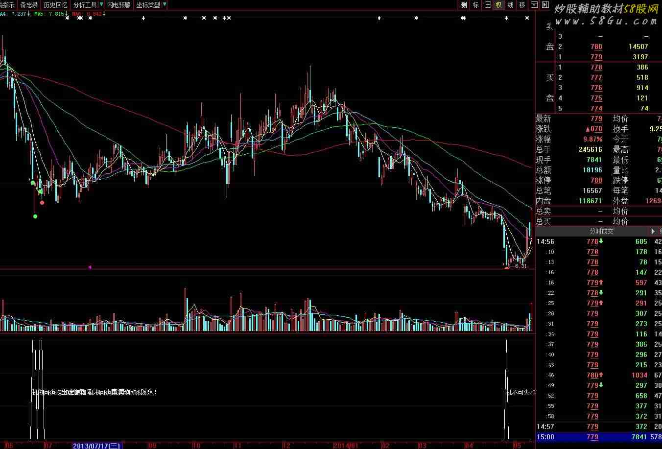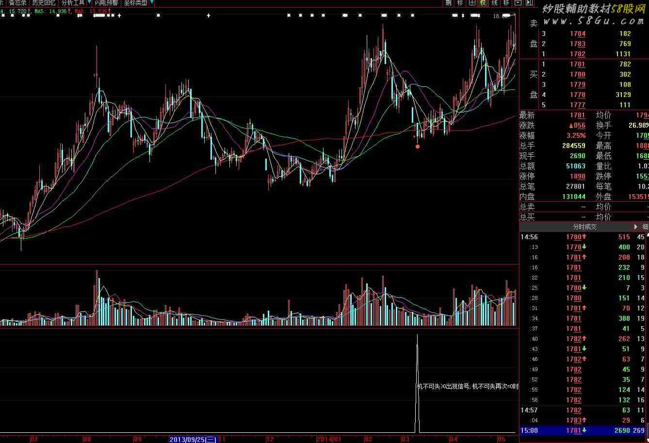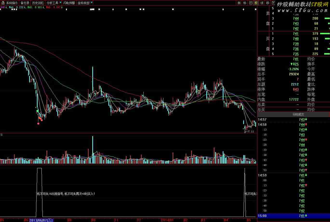 最后一个信号的第二天买入(机不可失>0出现信号,机不可失再次=0时买入) Var1:=SUM(IF(CLOSE>REF(CLOSE,1),VOL,IF(CLOSE < REF(CLOSE,1),0-VOL,0)),0); Var2:=SUMBARS(VOL,CAPITAL); Var3:=IF(CLOSE>LLV(CLOSE,Var2),1,-1)*IF(Var1>LLV(Var1,Var2),1,-1); Var4:=IF(Var3=-1,1,0); Var5:=COUNT(Var4=1,8)>2; Var6:=SUM(AMOUNT,13)/(AMOUNT/VOL/100)/100; Var7:=DMA((HIGH+LOW+CLOSE)/3,VOL/Var6); Var8:=(CLOSE-Var7)/Var7*100<-15; Var9:=(CLOSE-MIN(REF(CLOSE,5)*0.830,REF(CLOSE,21)*0.720))/CLOSE<0.05; 机不可失: Var8 AND Var9 AND Var5; DRAWTEXT(机不可失>0 AND REF(机不可失,1)=0,0.5,'机不可失>0出现信号,机不可失再次=0时买入!');    |