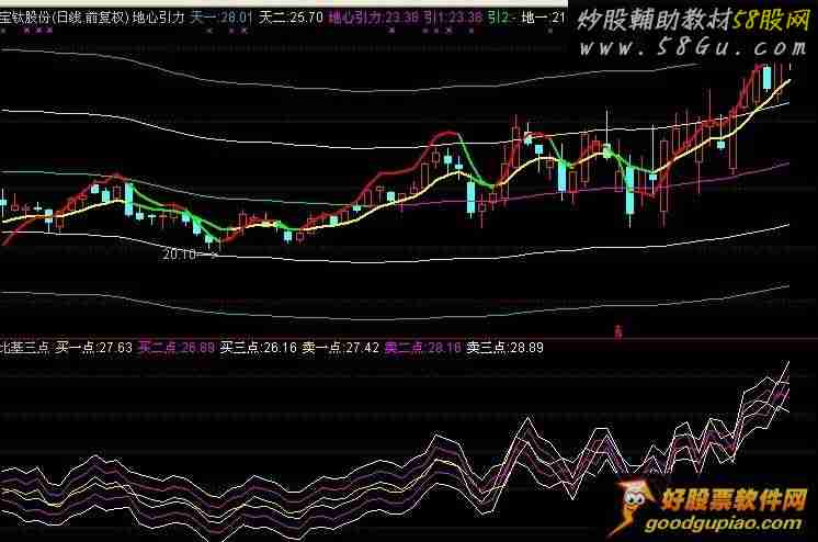 VAR1:=LLV(LOW,1); VAR2:=HHV(HIGH,1); VAR3:=VAR2-VAR1; 买一点:HIGH-0.188*REF(CLOSE,1)/10,COLORYELLOW; 买二点:HIGH-((0.188*REF(CLOSE,1)/10+0.718*REF(CLOSE,1)/10)/2),COLORMAGENTA; 买三点:HIGH-0.718*REF(CLOSE,1)/10,COLORWHITE;卖一点:LOW+0.188*REF(CLOSE,1)/10,COLORYELLOW; 卖二点:LOW+((0.188*REF(CLOSE,1)/10+0.718*REF(CLOSE,1)/10)/2),COLORMAGENTA; 卖三点:LOW+0.718*REF(CLOSE,1)/10,COLORWHITE;