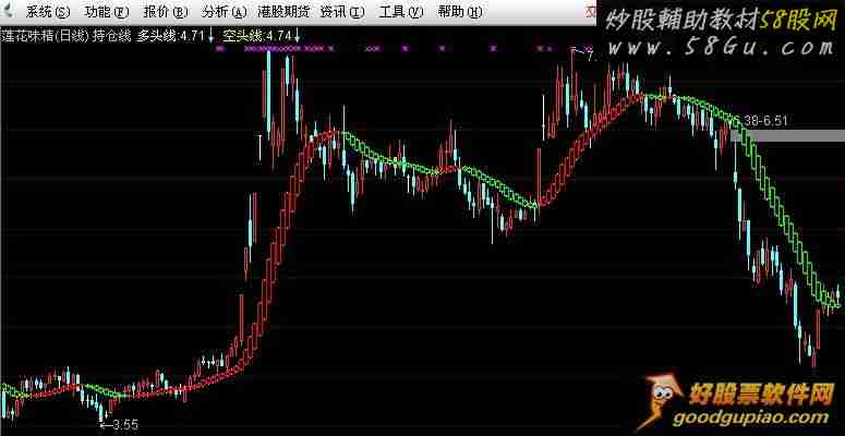VAR2:=(3*CLOSE+LOW+OPEN+HIGH)/6; 多头线:(20*VAR2+19*REF(VAR2,1)+18*REF(VAR2,2)+17*REF(VAR2,3)+16*REF(VAR2,4)+15*REF(VAR2,5)+14*REF(VAR2,6)+13*REF(VAR2,7)+12*REF(VAR2,8)+11*REF(VAR2,9)+10*REF(VAR2,10)+9*REF(VAR2,11)+8*REF(VAR2,12)+7*REF(VAR2,13)+6*REF(VAR2,14)+5*REF(VAR2,15)+4*REF(VAR2,16)+3*REF(VAR2,17)+2*REF(VAR2,18)+REF(VAR2,20))/210,CIRCLEDOT; 空头线:MA(多头线,5),CIRCLEDOT; STICKLINE(多头线>空头线,多头线,空头线,4,4),COLORRED; STICKLINE(多头线<空头线,多头线,空头线,4,4),COLOR00FF00; |
