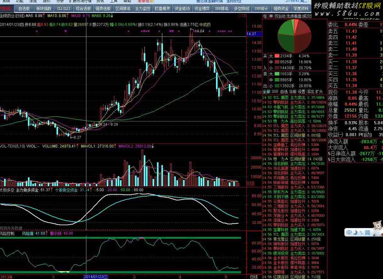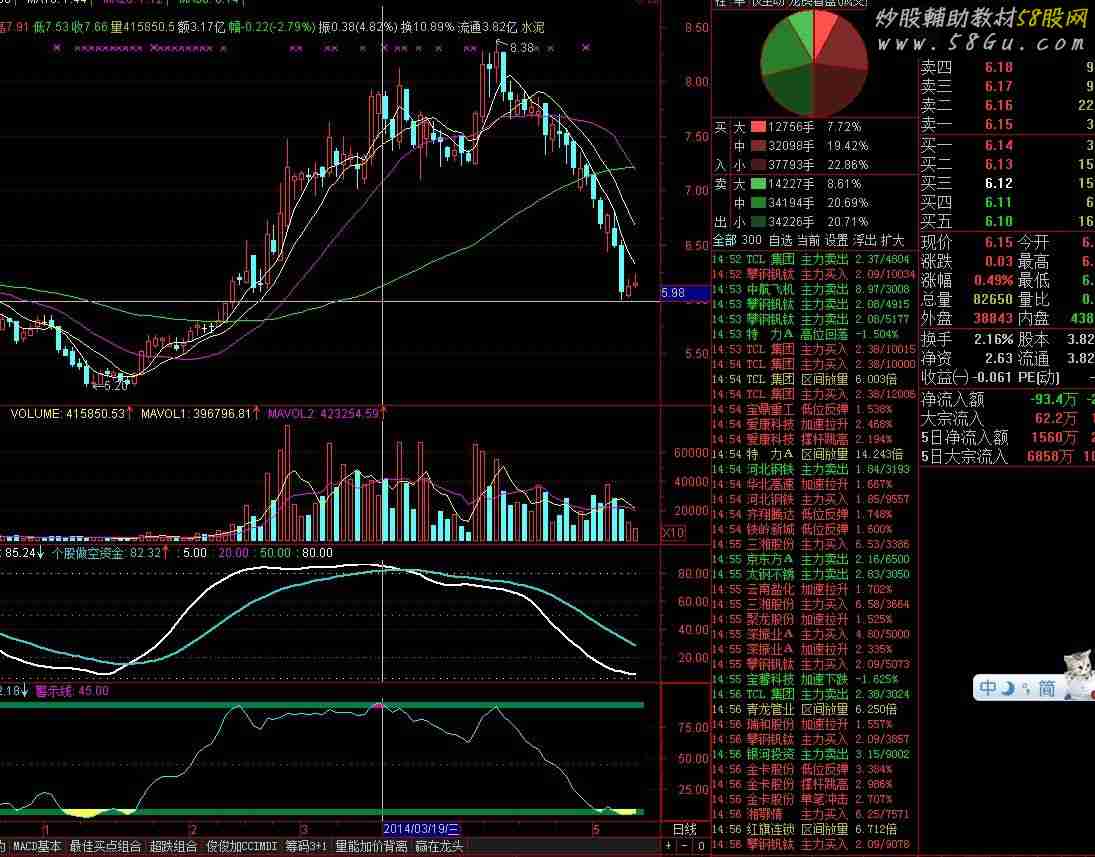正宗多空资金线,非原创,我只是提供正确的指标VAR0:=(2*CLOSE+HIGH+LOW)/4;B:=XMA((VAR0-LLV(LOW,30))/(HHV(HIGH,30)-LLV(LOW,30))*100,12);主力做多资金:EMA(B,3),LINETHICK2,COLORWHITE;个股做空资金:EMA(主力做多资金,18),COLORD9D919,LINETHICK2;5,POINTDOT,COLORWHITE;20,POINTDOT,COLORF00FF0;50,POINTDOT,COLORGREEN;80,POINTDOT,COLORWHITE;  |