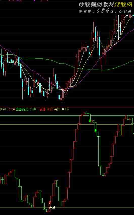 VAR2:=LLV(LOW,10); VAR3:=HHV(HIGH,25); 阶段卖出: 3.2,COLORYELLOW; 3.5,COLOR0088FF; 顶部清仓: 3.5,COLORGREEN,LINETHICK1; 动力线:= EMA((CLOSE-VAR2)/(VAR3-VAR2)*4,4); STICKLINE(动力线>REF(动力线,1) ,动力线 ,REF(动力线,1),3 ,1),COLORRED; STICKLINE(动力线<=REF(动力线,1) ,动力线 ,REF(动力线,1),3 ,1),COLOR00FF00; 底部:0.2,COLORRED,LINETHICK1; 关注:0.5,COLORYELLOW; DRAWICON( FILTER(CROSS(动力线,关注),20),动力线+0.02 ,1); DRAWICON( FILTER(CROSS(顶部清仓,动力线),20),动力线+0.02,2); DRAWICON( FILTER(CROSS(动力线,底部),20),动力线+0.02 ,1); DRAWICON( FILTER(CROSS(阶段卖出,动力线),20),动力线+0.02,2); DRAWICON( FILTER(CROSS(动力线,关注),20),动力线+0.02 ,1); DRAWTEXT(CROSS(动力线,关注),关注,'买底'),COLORWHITE;
