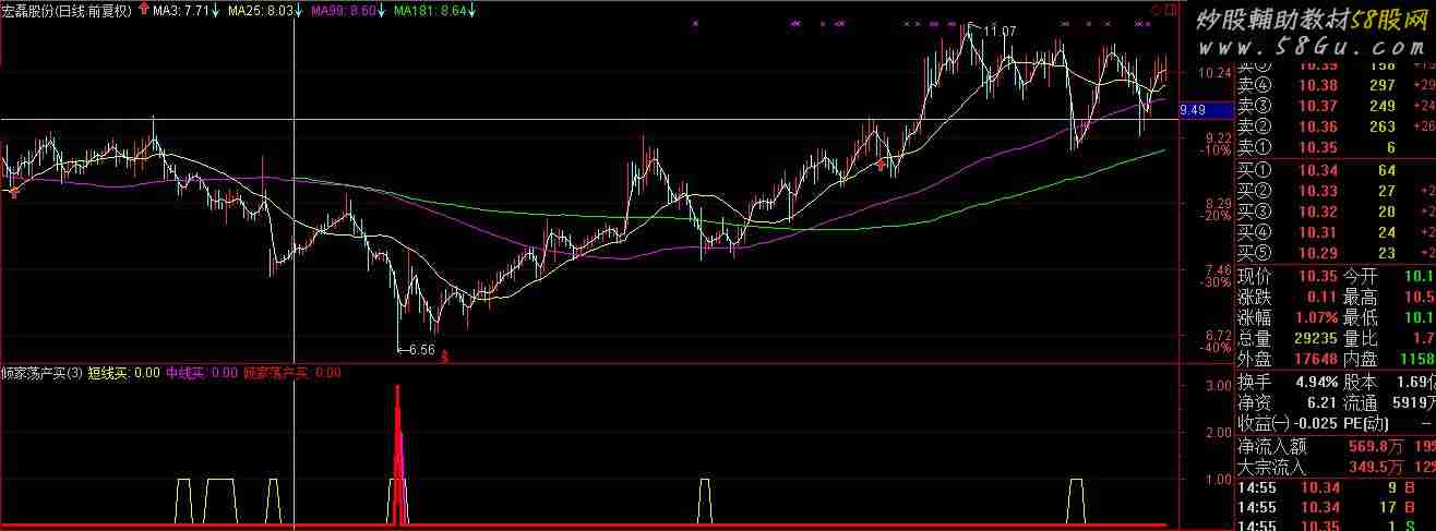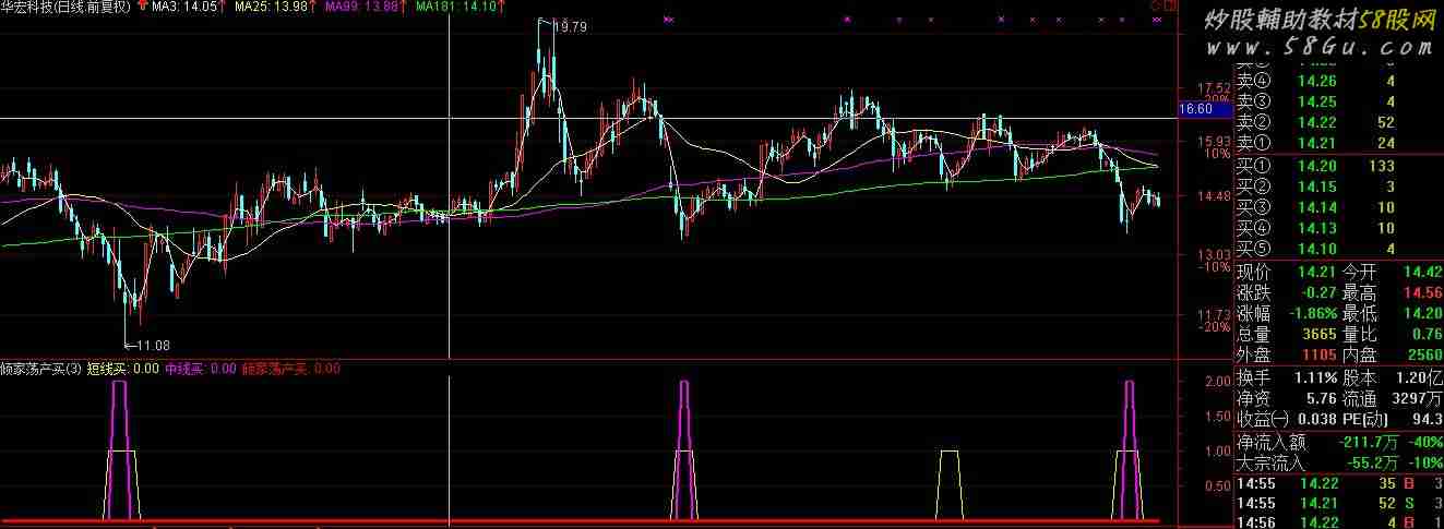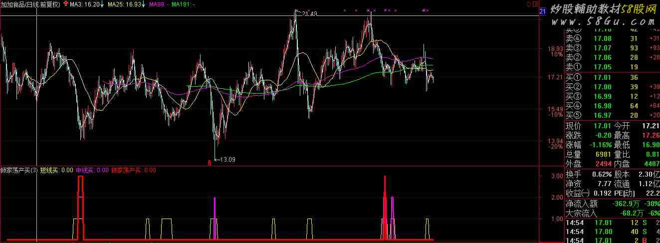 再来一精品,真正的精品,一看就懂倾家荡产买都老掉牙的公式 了,{N: 1, 100, 3} VAR1:=MA(HHV(HIGH,485),17); VAR2:=MA(HHV(HIGH,222),17); VAR3:=MA(HHV(HIGH,96),17); VAR4:=MA(LLV(LOW,485),17); VAR5:=MA(LLV(LOW,222),17); VAR6:=MA(LLV(LOW,96),17); VAR7:=MA((VAR4*0.96+VAR5*0.96+VAR6*0.96+VAR1*0.558+VAR2*0.558+VAR3*0.558)/6,17); VAR8:=MA((VAR4*1.25+VAR5*1.23+VAR6*1.2+VAR1*0.55+VAR2*0.55+VAR3*0.65)/6,17); VAR9:=MA((VAR4*1.3+VAR5*1.3+VAR6*1.3+VAR1*0.68+VAR2*0.68+VAR3*0.68)/6,17); VARA:=MA((VAR7*3+VAR8*2+VAR9)/6*1.738,17); VARB:=IF(DATE<=1050531,VARA,VARA*DAY); VARC:=LOW; VARD:=REF(LOW,1); VARE:=SMA(ABS(VARC-VARD),3,1)/SMA(MAX(VARC-VARD,0),N,1)*100; VARF:=MA(IF(CLOSE*1.35<=VARB,VARE*10,VARE/10),N); VAR10:=LLV(LOW,30); VAR11:=HHV(VARF,30); VAR12:=1990831; 绝佳买点:=IF(DATE<=VAR12,MA(IF(LOW<=VAR10,(VARF+VAR11*2)/2,0),N),100000000); I:=IF(CLOSE<REF(CLOSE,1),VOL/CAPITAL*10053,0); 骤雨初晴:= ABS(EMA(I,13.3)-18)/WINNER(CLOSE)*IF((CLOSE-MA(CLOSE,6))/MA(CLOSE,6)<-0.04,1,0); 短线买:IF(绝佳买点>500 AND 绝佳买点>2500,1,0),COLORYELLOW,LINETHICK1; 中线买:IF(绝佳买点>10000 AND 绝佳买点>20000,2,0),COLORFF00FF,LINETHICK2; 倾家荡产买:IF(绝佳买点>30000 AND 绝佳买点>30000,3,0),COLORRED,LINETHICK3;