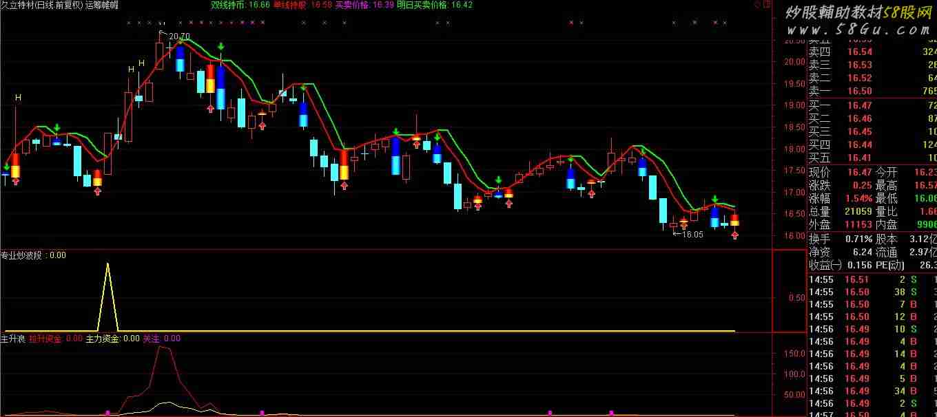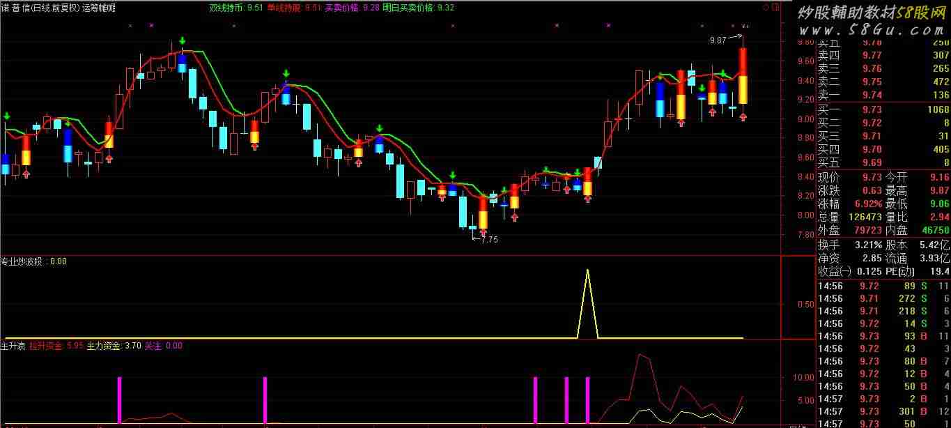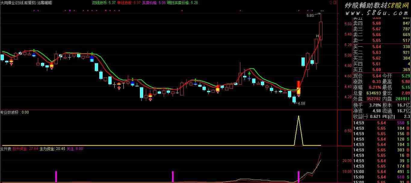不说虚的,本人的指标,能拿出来的,都是经过实战,准确度还算不错的指标,且都是没有未来函数的,还是延续上个主题的目的,http://www.55188.com/thread-5715697-1-1.html 本帖本着学习目的,本人自编指标很多年了,大家如果有什么指标方面的需要的话,只要不是太复杂(复杂需要太多时间),也可以发到本帖回复中,本人只要时间允许,可以帮忙修改及编辑!希望共同学习进步!还有记得帮忙加下果果,好有币发短消息哦! {结合macd刚好变红效果更好!源码可以用于附图选股预警} AA:=EMA(CLOSE,2)-EMA(CLOSE,89); AA1:=EMA(AA,30); AA2:=2*(AA-AA1)*10; AA3:=POW(AA2,3)*0.1+POW(AA2,2); AA4:=IF(AA2>0.015,AA3,0)/45; AA5:=EMA(CLOSE,2)-EMA(CLOSE,150); AA6:=EMA(AA5,100); AA7:=2*(AA5-AA6); AA8:=POW(AA7,3)*0.1+POW(AA7,1); GZ:=AA4+IF(AA7>0.1,AA8,0)*5; VAR1D:=EMA(CLOSE,2)-EMA(CLOSE,89); VAR1F:=2*(VAR1D-EMA(VAR1D,30))*10; VAR20:=POW(VAR1F,3)*0.1+POW(VAR1F,2); VAR25:=IF(YEAR<9999 AND VAR1F>0.015,VAR20,0)/45; YZ:=VAR25/10,COLORRED; VAR26:=EMA(CLOSE,2)-EMA(CLOSE,150); VAR27:=EMA(VAR26,100); VAR28:=2*(VAR26-VAR27); VAR29:=POW(VAR28,3)*0.1+POW(VAR28,1); ZL:=IF(YEAR<9999 AND VAR28>0.1,VAR29,0)*5/10; WW:=EMA((ZL+YZ),22); CROSS(WW,MA(WW,3)) AND C>O AND GZ>0 AND REF(GZ,1)=0,COLORYELLOW,LINETHICK2;   |