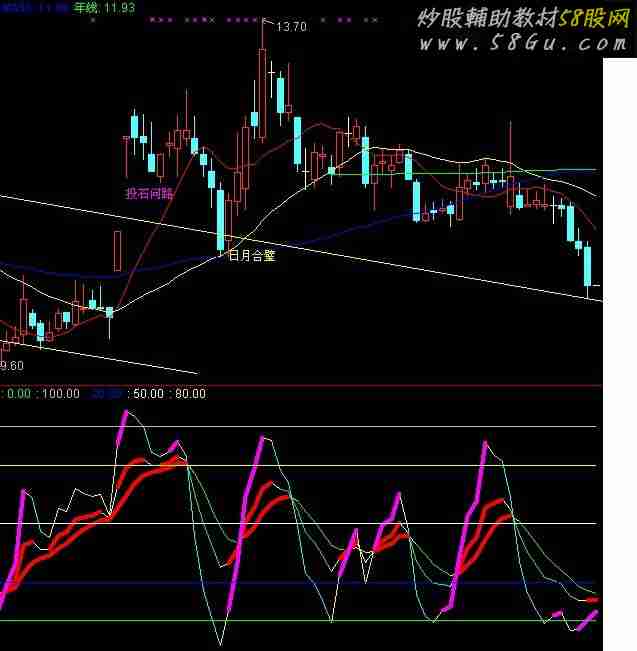 红紫线持有黄线转头提示见底顶及时买卖。红+紫持有,只要有一根在就不卖出,三根在的话可以伺机加仓,其余观望。 底部黄线转头提示见底,应及时买入。 红紫线消失,黄线出现为最佳出货时机,蓝绿色线观望等待。 紫或红线一根根减少是提示股价即将见顶,可以见好就收了,可作提前出货的提示。RSV:=(CLOSE-LLV(LOW,9))/(HHV(HIGH,9)-LLV(LOW,9))*100; K:SMA(RSV,3,1),COLORWHITE; D:SMA(K,3,1),COLORYELLOW; J:3*K-2*D,COLORYELLOW; IF(K<REF(K,1),K,DRAWNULL),COLORGREEN,LINETHICK1; IF(D<REF(D,1),D,DRAWNULL),COLORGREEN,LINETHICK1; IF(J<REF(J,1),J,DRAWNULL),COLORFFFF00,LINETHICK1; IF(K>REF(K,1),K,DRAWNULL),COLORRED,LINETHICK4; IF(D>REF(D,1),D,DRAWNULL),COLORRED,LINETHICK4; IF(J>REF(J,1),J,DRAWNULL),COLORFF00FF,LINETHICK4; 0; 100; 20; 50; 80;