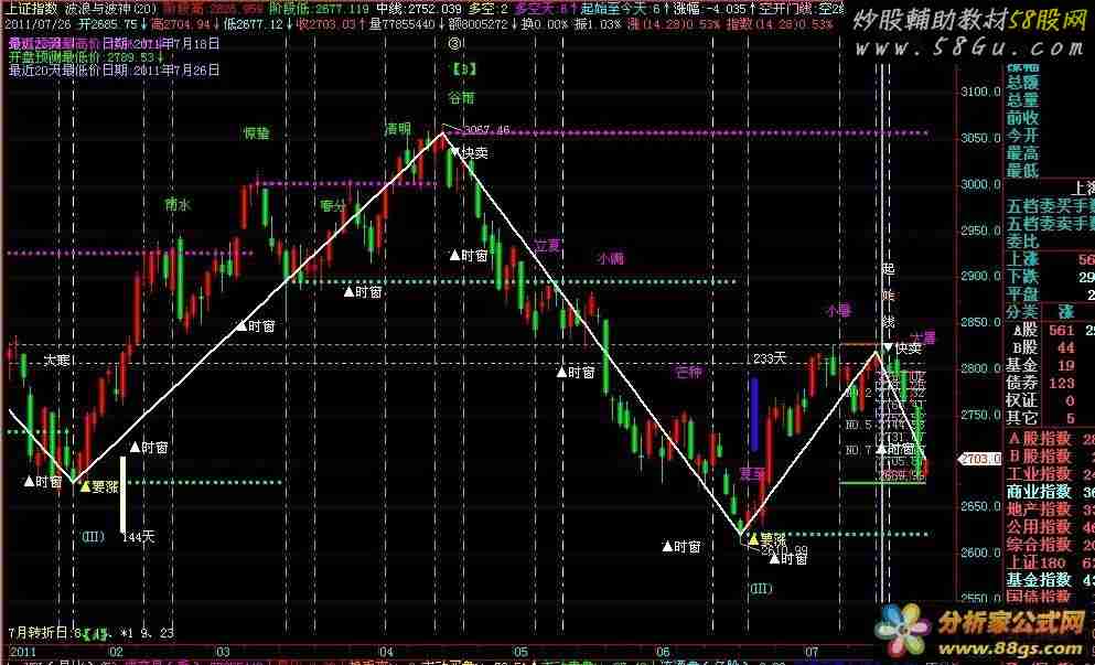 波浪与波神 INPUT:最近天(20,1,360); 当前月:=FRACPART(ROUND(当前日期/100)/100)*100; 月:=MONTH;日:=DAY; VERTLINE(月=1 AND ( 日=25)),COLORFFFFFF,LINEDASHDOT; VERTLINE(月=3 AND ( 日=20)),COLORFFFFFF,LINEDASHDOT; VERTLINE(月=5 AND ( 日=12)),COLORFFFFFF,LINEDASHDOT; VERTLINE(月=6 AND (日=14 )),COLORFFFFFF,LINEDASHDOT; VERTLINE(月=7 AND ( 日=19 )),COLORFFFFFF,LINEDASHDOT; VERTLINE(月=8 AND ( 日=6 )),COLORFFFFFF,LINEDASHDOT; VERTLINE(月=9 AND ( 日=18 )),COLORFFFFFF,LINEDASHDOT; VERTLINE(月=10 AND ( 日=31)),COLORFFFFFF,LINEDASHDOT; VERTLINE(月=11 AND ( 日=28)),COLORFFFFFF,LINEDASHDOT; VERTLINE(月=12 AND ( 日=31)),COLORFFFFFF,LINEDASHDOT; VERTLINE(月=1 AND ( 日=6 OR 日=15 OR 日=21 )),COLORAAAAAA,LINEDASHDOT; VERTLINE(月=2 AND ( 日=6 OR 日=15 OR 日=21 )),COLORAAAAAA,LINEDASHDOT; VERTLINE(月=3 AND ( 日=6 OR 日=15 OR 日=21 )),COLORAAAAAA,LINEDASHDOT; VERTLINE(月=4 AND ( 日=6 OR 日=15 OR 日=21 )),COLORAAAAAA,LINEDASHDOT; VERTLINE(月=5 AND ( 日=6 OR 日=15 OR 日=21 )),COLORAAAAAA,LINEDASHDOT; VERTLINE(月=6 AND ( 日=6 OR 日=21)),COLORAAAAAA,LINEDASHDOT; VERTLINE(月=7 AND ( 日=8 OR 日=15 OR 日=23)),COLORAAAAAA,LINEDASHDOT; VERTLINE(月=8 AND ( 日=8 OR 日=15 OR 日=23)),COLORAAAAAA,LINEDASHDOT; VERTLINE(月=9 AND ( 日=8 OR 日=15 OR 日=23)),COLORAAAAAA,LINEDASHDOT; VERTLINE(月=10 AND ( 日=8 OR 日=15 OR 日=23 )),COLORAAAAAA,LINEDASHDOT; VERTLINE(月=11 AND ( 日=8 OR 日=15 OR 日=23)),COLORAAAAAA,LINEDASHDOT; VERTLINE(月=12 AND ( 日=8 OR 日=15 OR 日=23 )),COLORAAAAAA,LINEDASHDOT;N:=if(sysparam(1)=datacount,最近天,datacount-sysparam(1)); HH:=HHV(HIGH,N); LL:=LLV(LOW,N); VN:=N; {LAST1:=DATACOUNT;} IF VN>DATACOUNT THEN VN:=DATACOUNT+1; FOR I=DATACOUNT DOWNTO DATACOUNT-VN+1 DO BEGIN HH[I]:=HH[DATACOUNT]; LL[I]:=LL[DATACOUNT]; END; TMP:=SETLBOUND(hh,DATACOUNT-VN+1); TMP:=SETLBOUND(ll,DATACOUNT-VN+1); 阶段高:HH,LINETHICK2,color0000FF;阶段低:LL,LINETHICK2,color00FF00; 中线:(HH+LL)/2,linethick0; KKH:=BARSLAST(H=HH); KKL:=BARSLAST(L=LL); N低日:=STRTONUM(NUMTOSTR(REF(DATE,KKL),0)),LINETHICK; N高日:=STRTONUM(NUMTOSTR(REF(DATE,KKH),0)),LINETHICK; 多空:IF(N低日>N高日,2,1),LINETHICK0; 多空天:IF(N低日<N高日,kkl,kkh),LINETHICK0;DATE1:=IF(多空=1,N低日,N高日);{} hh0:=ref(h,BARSLAST(DATE1=DATE)); ll0:=ref(l,BARSLAST(DATE1=DATE)); H1:=STRTONUM(NUMTOSTR(Hh0,3)),POINTDOT; L1:=STRTONUM(NUMTOSTR(Ll0,3)),POINTDOT; PARTLINE(1,H1),,POINTDOT,linethick0; PARTLINE(1,L1),,POINTDOT,linethick0; LL:=H1 - L1; VERTLINE(DATE=DATE1),COLORFFAAAA,,LINETHICK2; DRAWTEXT(DATE=DATE1,SYSPARAM(4)*0.95,'起\n \n始\n \n线'),COLORFFFFFF; 起始至今天:BARSLAST(DATE1=DATE),COLORFFFF00,LINETHICK0; 涨幅:(C-REF(C,起始至今天))/REF(C,起始至今天)*100,COLORFFDDDD,LINETHICK0; IF 多空=1 THEN BEGIN {看多} 开门线: PARTLINE(DATE>=N低日,LL*1.50801 + L1),LINETHICK1,COLOREE99FF;; PARTLINE(DATE>=N低日,LL*2.00001 + L1),COLOR9999FF,LINEDOT; 多2线: PARTLINE(DATE>=N低日,LL*2.40001 + L1),COLORFFFF99,linethick1; PARTLINE(DATE>=N低日,LL*3.05001 + L1),COLOR99FF99,LINEDOT; PARTLINE(DATE>=N低日,LL*3.75001 + L1),COLORFF9999,LINEDOT; 多5线: PARTLINE(DATE>=N低日,LL*4.15001 + L1),COLORMAGENTA,linethick2,LINEDOT; PARTLINE(DATE>=N低日,LL*4.80001 + L1),COLORRED,LINEDOT; 多7线: PARTLINE(DATE>=N低日,LL*5.50001 + L1),COLORCYAN,linethick2; PARTLINE(DATE>=N低日,LL*6.10001 + L1),COLORGREEN,LINEDOT; PARTLINE(DATE>=N低日,LL*6.90001 + L1),LINETHICK1,COLORRED; DRAWTEXT(SYSPARAM(3)=BARPOS,L1+LL*1.50801+0.002,NUMTOSTR(L1+LL*1.50801,2)),COLORAAAAAA,ALIGN2; DRAWTEXT(SYSPARAM(3)=BARPOS,L1+LL*2.00001+0.002,NUMTOSTR(L1+LL*2.00001,2)),COLORAAAAAA,ALIGN2; DRAWTEXT(SYSPARAM(3)=BARPOS,L1+LL*2.40001+0.002,'NO.2 '+NUMTOSTR(L1+LL*2.40001,2)),COLORAAAAAA,ALIGN2; DRAWTEXT(SYSPARAM(3)=BARPOS,L1+LL*3.05001+0.002,NUMTOSTR(L1+LL*3.05001,2)),COLORAAAAAA,ALIGN2; DRAWTEXT(SYSPARAM(3)=BARPOS,L1+LL*3.75001+0.002,NUMTOSTR(L1+LL*3.75001,2)),COLORAAAAAA,ALIGN2; DRAWTEXT(SYSPARAM(3)=BARPOS,L1+LL*4.15001+0.002,'NO.5 '+NUMTOSTR(L1+LL*4.15001,2)),COLORAAAAAA,ALIGN2; DRAWTEXT(SYSPARAM(3)=BARPOS,L1+LL*4.80001+0.002,NUMTOSTR(L1+LL*4.80001,2)),COLORAAAAAA,ALIGN2; DRAWTEXT(SYSPARAM(3)=BARPOS,L1+LL*5.50001+0.002,'NO.7 '+NUMTOSTR(L1+LL*5.50001,2)),COLORAAAAAA,ALIGN2; DRAWTEXT(SYSPARAM(3)=BARPOS,L1+LL*6.10001+0.002,NUMTOSTR(L1+LL*6.10001,2)),COLORAAAAAA,ALIGN2; DRAWTEXT(SYSPARAM(3)=BARPOS,L1+LL*6.90001+0.002,NUMTOSTR(L1+LL*6.90001,2)),COLORAAAAAA,ALIGN2; DRAWTEXT(DATE=DATE1,LL*1.50801 + L1+0.002,'多开门'),colorred; DRAWTEXT(DATE=DATE1,LL*6.90001 + L1+0.002,'多关门'),colorred; END; ELSE BEGIN {看空} 空开门线: PARTLINE(DATE>=N高日,H1-LL*1.50801),LINETHICK1,COLOREE99FF; PARTLINE(DATE>=N高日,H1-LL*2.00001),COLOR9999FF,LINEDOT; 空2线: PARTLINE(DATE>=N高日,H1-LL*2.40001),COLORFFFF99; PARTLINE(DATE>=N高日,H1-LL*3.05001),COLOR99FF99,LINEDOT; PARTLINE(DATE>=N高日,H1-LL*3.75001),COLORFF9999,LINEDOT; 空5线: PARTLINE(DATE>=N高日,H1-LL*4.15001),COLORMAGENTA; PARTLINE(DATE>=N高日,H1-LL*4.80001),COLORRED,LINEDOT; 空7线: PARTLINE(DATE>=N高日,H1-LL*5.50001),COLORCYAN; PARTLINE(DATE>=N高日,H1-LL*6.10001),COLORGREEN,LINEDOT; 空关门线: PARTLINE(DATE>=N高日,H1-LL*6.90001),LINETHICK1,COLORRED; DRAWTEXT(DATE=DATE1,H1-LL*1.50801+0.002,'空开门'),color3333FF; DRAWTEXT(DATE=DATE1,H1-LL*6.90001+0.002,'空关门'),color3333FF; DRAWTEXT(SYSPARAM(3)=BARPOS,H1-LL*1.50801+0.002,NUMTOSTR(H1-LL*1.50801,2)),COLORAAAAAA,ALIGN2; DRAWTEXT(SYSPARAM(3)=BARPOS,H1-LL*2.00001+0.002,NUMTOSTR(H1-LL*2.00001,2)),COLORAAAAAA,ALIGN2; DRAWTEXT(SYSPARAM(3)=BARPOS,H1-LL*2.40001+0.002,'NO.2 '+NUMTOSTR(H1-LL*2.40001,2)),COLORAAAAAA,ALIGN2; DRAWTEXT(SYSPARAM(3)=BARPOS,H1-LL*3.05001+0.002,NUMTOSTR(H1-LL*3.05001,2)),COLORAAAAAA,ALIGN2; DRAWTEXT(SYSPARAM(3)=BARPOS,H1-LL*3.75001+0.002,NUMTOSTR(H1-LL*3.75001,2)),COLORAAAAAA,ALIGN2; DRAWTEXT(SYSPARAM(3)=BARPOS,H1-LL*4.15001+0.002,'NO.5 '+NUMTOSTR(H1-LL*4.15001,2)),COLORAAAAAA,ALIGN2; DRAWTEXT(SYSPARAM(3)=BARPOS,H1-LL*4.80001+0.002,NUMTOSTR(H1-LL*4.