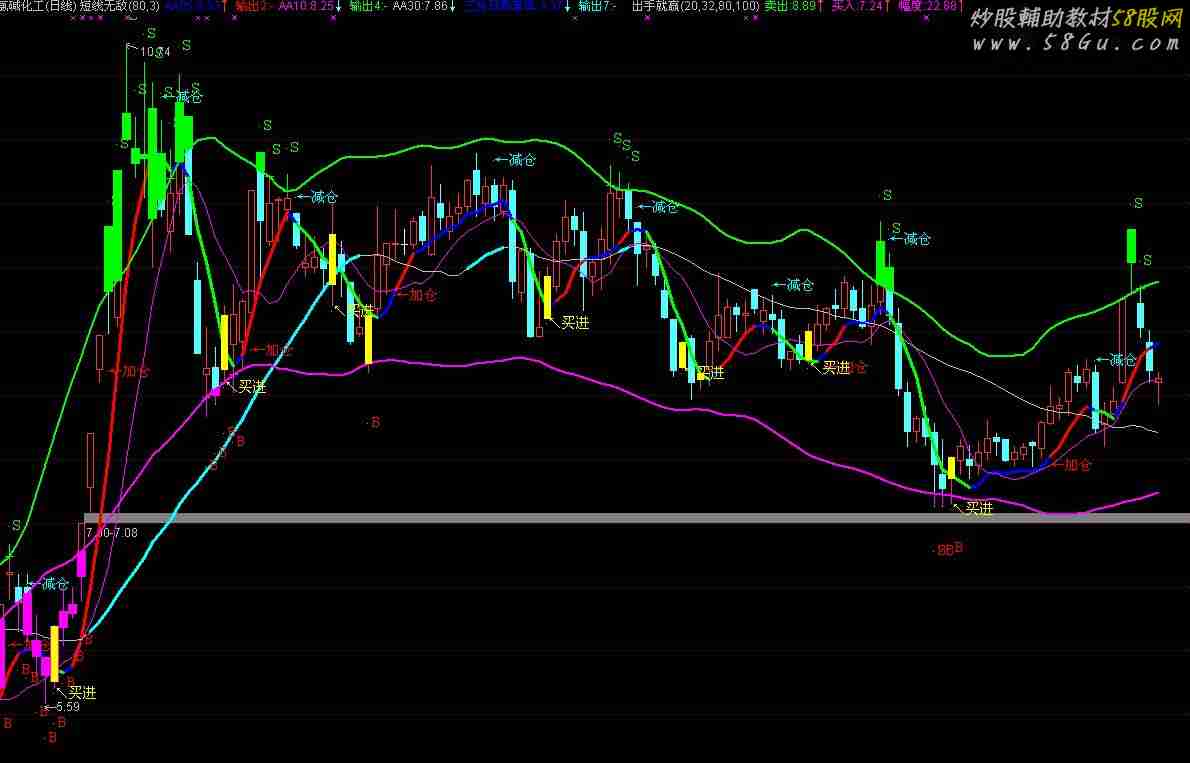 n(1.00 999.00 80.00)m(1.00 15.00 3.00)高1:=REF(HHV(H,150),3); 低1:=REF(LLV(L,150),3); H1:=高1-(高1-低1)*0.191; H2:=高1-(高1-低1)*0.382; H3:=高1-(高1-低1)*0.5; H4:=高1-(高1-低1)*0.618; H5:=高1-(高1-低1)*0.809; {顶:REFDATE(高1,DATE),POINTDOT,COLORWHITE;} %19:=REFDATE(H1,DATE),POINTDOT,COLORYELLOW,LINETHICK3; %38:=REFDATE(H2,DATE),POINTDOT,COLORMAGENTA,LINETHICK3; %50:=REFDATE(H3,DATE),POINTDOT,COLORBLUE,LINETHICK3; %61:=REFDATE(H4,DATE),POINTDOT,COLORRED,LINETHICK3; %80:=REFDATE(H5,DATE),POINTDOT,COLORWHITE,LINETHICK3; AA05:MA(C,5),LINETHICK3,COLORBLUE; 五日乖离率:=(C-AA05)/AA05*100; BB05:=ATAN((AA05/REF(AA05,1)-1)*100)*180/3.1416; 速度5:=SMA(EMA((AA05-REF(AA05,1))/REF(AA05,1),3)*100,3,1); 加速度5:=EMA((速度5-REF(速度5,1)),3),NODRAW; IF(BB05>30 AND AA05>REF(AA05,1), AA05,DRAWNULL),LINETHICK3,COLORRED; AA10:MA(C,10);AA20:=MA(C,20); BB10:=ATAN((AA10/REF(AA10,1)-1)*100)*180/3.1416; IF(BB05<0 AND AA05<REF(AA05,1), AA05,DRAWNULL),LINETHICK3,COLORGREEN ; AA30:MA(C,30); 三拾日乖离率:(C-AA30)/AA30*100,NODRAW; VAR1:=(AA20-AA30)>REF((AA20-AA30),1) AND AA20>REF(AA20,1) AND AA30>REF(AA30,1); VAR2:=(AA30-AA20)<REF((AA30-AA20),1) AND AA20<REF(AA20,1) AND AA30<REF(AA30,1); BB30:=ATAN((AA30/REF(AA30,1)-1)*100)*180/3.1416; IF(BB30>15 AND AA30>REF(AA30,1), AA30,DRAWNULL),LINETHICK3,COLORFF00FF,COLORCYAN; 强势狙击:=FILTER(BB30>30 AND BB10>45 AND CROSS(BB05,60),10); 加仓:=FILTER(COUNT(CROSS(BB05,30),5)>=1 AND AA05>REF(AA05,1) AND 三拾日乖离率>REF(三拾日乖离率,1) AND AA10>REF(AA10,1) AND 加速度5>REF(加速度5,1) AND 速度5>REF(速度5,1),10) ; 清仓:=FILTER(COUNT(CROSS(30,BB05),5)>=1 AND (C>AA30 OR O>AA30) AND AA05<REF(AA05,1) AND 三拾日乖离率<REF(三拾日乖离率,1) AND AA10<REF(AA10,1),10); DRAWTEXT(加仓 ,LOW*0.98,'←加仓'),COLORRED; JC:=CROSS(0,五日乖离率) AND 三拾日乖离率<REF(三拾日乖离率,1) AND AA10>REF(AA10,1) ; 减仓:=FILTER(JC,10); MR:=COUNT(CROSS(五日乖离率,0),3)>=1 AND 三拾日乖离率>REF(三拾日乖离率,1) AND AA05>REF(AA05,1) AND (C/REF(C,1)-1)*100>5 AND REF(C,1)<AA30; 买入:=FILTER(MR,10); DRAWTEXT(减仓,HIGH*1.02,'←减仓'),COLORCYAN; DRAWTEXT(买入,LOW*0.98,'←买入'),COLORYELLOW; VAR21:=MAX(ABS(HIGH-AMOUNT/VOL/100),ABS(AMOUNT/VOL/100-LOW)); VAR3:=ABS((OPEN+CLOSE)/2-AMOUNT/VOL/100); MV:=(VAR21+VAR3)/AMOUNT*VOL*100*50;