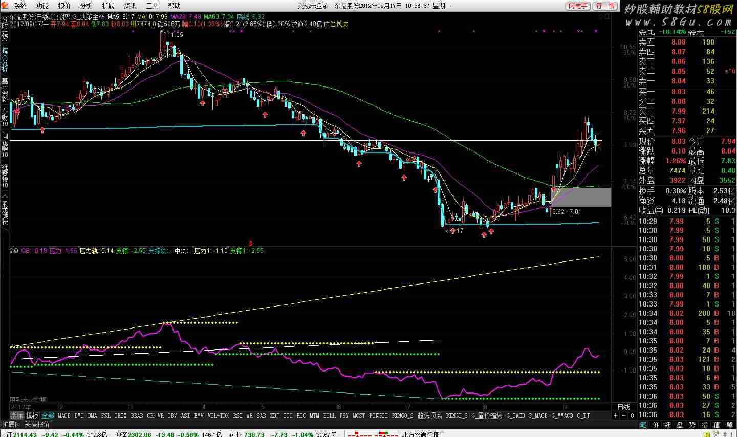 豆豆1:=QS; A1:=REF(豆豆1,10)=HHV(豆豆1,2*10+1); B1:=FILTER(A1,10); C1:=BACKSET(B1,10+1); HD:=FILTER(C1,10); A2:=REF(豆豆1,10)=LLV(豆豆1,2*10+1); B2:=FILTER(A2,10); C2:=BACKSET(B2,10+1); LD:=FILTER(C2,10); A:=REF(QS,BARSLAST(HD)); B:=REF(QS,BARSLAST(LD)); T1:=BARSLAST(HD)<BARSLAST(LD) AND NOT(HD) ; T2:=BARSLAST(HD)>BARSLAST(LD) AND NOT(LD); 压力1:IF(T1,A,A),COLORYELLOW,POINTDOT,LINETHICK4; 支撑1:IF(T2,B,B),COLORGREEN,POINTDOT,LINETHICK4; 【研判方法】: 粉色线代表趋势,结合压力支撑线(虚线)和方向线(黄白蓝线)综合研判股价趋势,非常清晰!!!