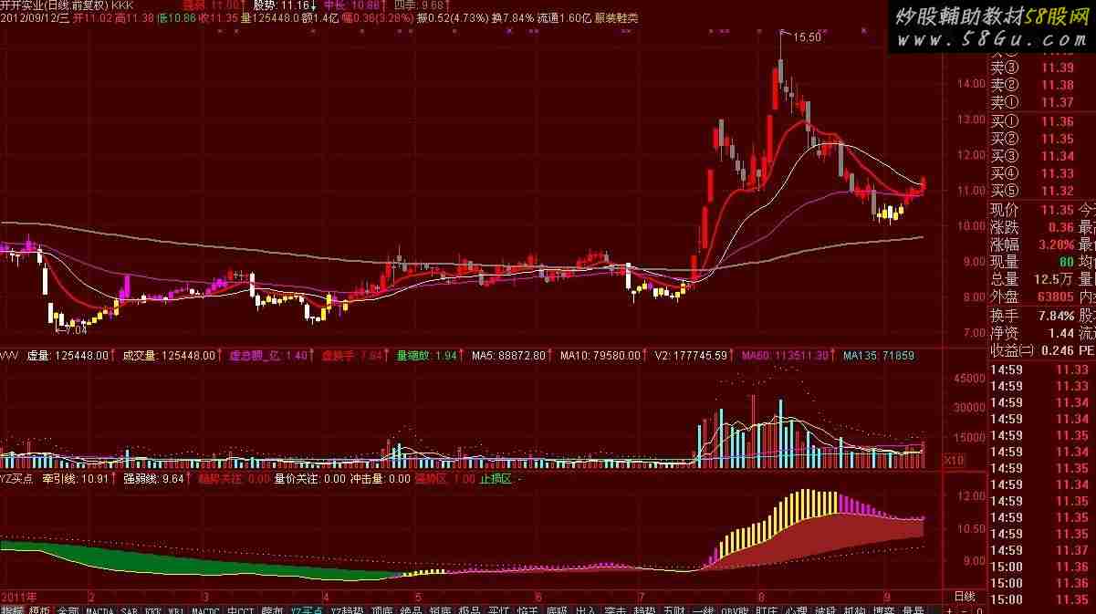 VAR1:=(2*C+H+L)/4; VAR2:=MA(VAR1,5); VAR3:=MA(VAR1,21); VAR4:=MA(VAR1,60); 昨收:=DYNAINFO(3),COLORGRAY; 低:=DYNAINFO(6),POINTDOT,COLORYELLOW; STICKLINE(VAR1>=VAR2,CLOSE,OPEN,3,0),COLORFF00FF; STICKLINE(VAR1>=VAR2,HIGH,LOW,0,0),COLORFF00FF; STICKLINE(VAR1<VAR2,CLOSE,OPEN,3,0),COLORWHITE; STICKLINE(VAR1<VAR2,HIGH,LOW,0,0),COLORWHITE; STICKLINE(VAR1<=VAR3 AND VAR1>OPEN,CLOSE,OPEN,3,0),COLORYELLOW; STICKLINE(VAR1<=VAR3 AND VAR1>OPEN,HIGH,LOW,0,0),COLORYELLOW; STICKLINE(VAR1>=VAR4 AND VAR1>OPEN,CLOSE,OPEN,3,0),COLORRED; STICKLINE(VAR1>=VAR4 AND VAR1>OPEN,HIGH,LOW,0,0),COLORRED; STICKLINE(VAR1>=VAR4 AND VAR1<OPEN,CLOSE,OPEN,3,0),COLORGRAY; STICKLINE(VAR1>=VAR4 AND VAR1<OPEN,HIGH,LOW,0,0),COLORGRAY; 强弱:(MA(VAR1,3)+MA(VAR1,6)+MA(VAR1,12)+MA(VAR1,24))/4,COLORRED,LINETHICK2; 股势:(MA(VAR2,5)+MA(VAR2,13)+MA(VAR2,21)+MA(VAR2,34))/4,COLORWHITE; 中长:EMA(VAR1,55),COLORFF00FF; 四季:(MA(VAR1,63)+MA(VAR1,126)+MA(VAR1,189)+MA(VAR1,252))/4,COLORGRAY,LINETHICK2; |