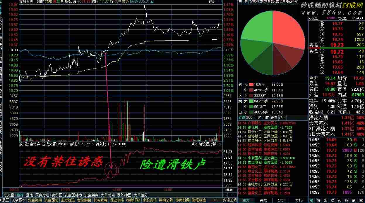流水贴二:分时资金博弈(加指标及看盘版面)公式不成熟,不过比照系统自带的"资金博弈"来看,比较一目了然. 现在需要考虑的是,盘中如何预警出: "流入比"快速上升的股票,而不是按涨序排名,因为分时不同于日线指标排序的排名. 日分钟内的操作属于超级短线,不论是版面还是此类指标,都是追涨杀跌.如何提高成功率,是盘面盘感及操盘高低的问题.