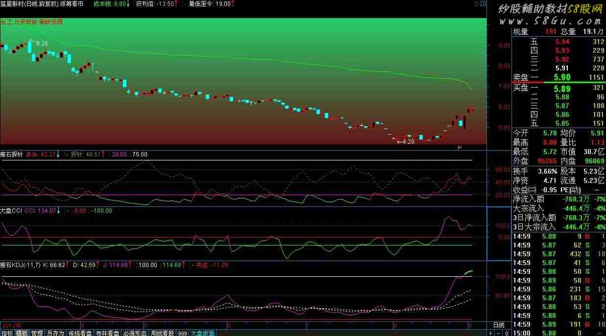 虚年华 朱颜空自改(待踏马蹄清夜月之三)经典指标协同看盘 与前贴相对应: 主图 市场筹码形态及获利线 详情请关注上一拙贴内容,不再复叙 副图:1, DMI 2.CCI 3,KDJ 说明:一主三副构成了一看盘模板.不论大盘或个股均可看出其前世今生,以及相对的未来趋势. 原理: 三副图不要孤立来看,要三者相结合判断大势. 激进者也要以少数服从多数的原则为第一宗旨.即不可以单独的信号为依据,防止主力骗线,不见兔子不撒鹰,筹码是自已的,要珍惜. 为了直观起见,三个副图都做了相应的美化. 自用的KDJ略有不同,主要用来做中长线,但放入进来一样适用其余两个指标的协同作战.此指标和DMA及主图指标上传给同学们,CCI请同学们自行美化或者就用系统自带的即可,另外关注下这两个指标的用法与实战技法.CCI是短线最敏锐的指标,DMI是最据有实战意义的指标.这是我个人的一点偏好.同学们也可以自已总结自认为实用的指标做为操盘的参考.此贴仅为抛砖引玉之用. 指标是对前期走势的一种形而上的图线表达方式,不代表主力未来一定就会按照指标反应出的意图来走.切记. 任何指标都不是万能的,也不可以以一个单独的指标来指导操作,没有意义,风险也较大. 三指联动,与主图映照.至少在心理上对我们的操作构成一个支撑,避免了盲目的进出,使得手上斗寸折损. 因笔记本屏较小,没有安排进成交量副图,这是不可或缺的,请同学们自行编入. PS:此贴是为了完善上两上贴子之用,也是对其构成的一个补充,权当一个补丁来看.以后关于指标的贴子皆转移至公式区.此处掷笔.望版主及班长见谅. 模板详解:1. 因为CCI的灵敏,它是最早发现异动,所以当其从小上穿-100时,原则上建仓点,但是要看其它两指标的情况,若DMI(多头)依然向下,KDJ中J值没有勾头向上,那么这个点可以放弃.若正好相反,两线皆向上,那么这个建仓点就相对稳妥的多,一二个交易日必见利.2. CCI 上穿-100 后,DMI(多头)上穿20,则代表多头进场.J值向上.则是短线介入点.只要是三线向上共振,都是不错的关注点位,显示出个股的主力有蠢蠢欲动之势.3 .CCI 上穿0后,DMI(多头)继续向上上攻,KDJ值金叉,则是加仓的时机.主力已经非常明显的要做多.可持股做收渔利.4. 卖点的确定: Ⅰ 卖点最敏感的是DMI中的ADX(瘦石探针),只要出现拐头,则是第一卖点,至少是减仓操作,避免突然杀跌被套牢.当然也可能会是一个短线的震仓.此时需要自已多年的盘感及对大势的把握来判断自已的操作方向了. Ⅱ J值上穿100以后,股价上升,J值超买,此时关注另两个指标的表现.如果J值向下穿100,则是另一个卖点.不向下穿或一直在KD两值之上,如做中线可一直持有,直到死叉. Ⅲ CCI因为敏感下穿100,原则是卖出点,跌破零轴是清仓休息的时候.哪个阶段要看其它两指的表现. Ⅳ DMI(多头)如果下穿20,则成了空头天下.若CCI也变绿,J值处于K/D线下方,则是熊市来临.此时最适的合操作是旅游或钓鱼.