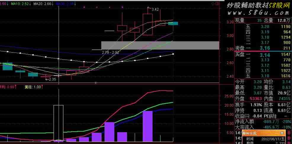 说明:股价一定要站稳5日均线才能买进。 收:=WINNER(C)*100;开:=WINNER(O)*100;博弈:MAX(ABS(收-开),ABS(收-REF(收,1))),POINTDOT,COLORMAGENTA;散筹:EMA((WINNER(C*1.1)-WINNER(C*0.9))*70,5),COLOR66FF00,LINETHICK2;庄筹:EMA(WINNER(C)*70,5),COLORBLUE,LINETHICK2;获利:EMA(WINNER(C)*100,3),COLOR7F00FF,LINETHICK2;STICKLINE(庄筹>散筹,庄筹,散筹,0,0),COLORRED;STICKLINE(收>REF(收,1),0,博弈,3,0),COLORFF3399;STICKLINE(收< REF(收,1),0,博弈,0,0),COLORCYAN;STICKLINE(CROSS(获利,庄筹) AND 庄筹<5,庄筹,20,3,1),COLORYELLOW;黄柱:(CROSS(获利,庄筹) AND 庄筹<5),COLORYELLOW; |