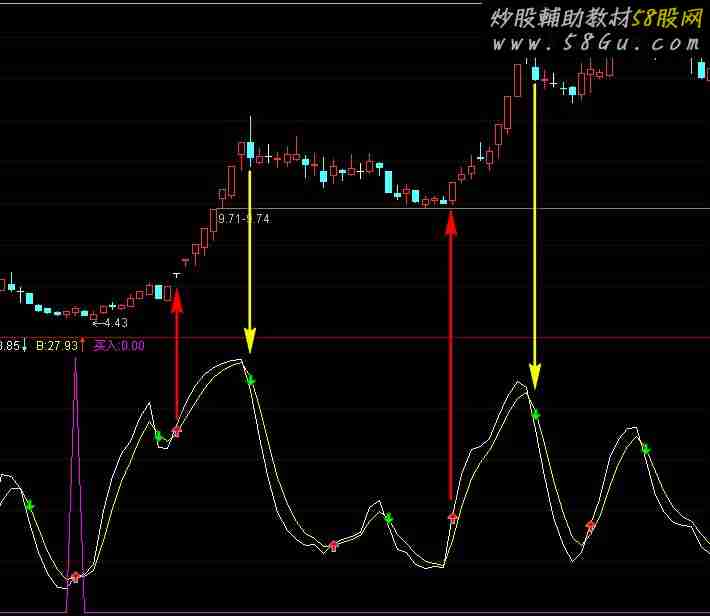 LOWV:=LLV(LOW,3 ); HIGHV:=HHV(HIGH,7); RSV:=EMA((CLOSE-LOWV)/(HIGHV-LOWV)*100,3); A:EMA(RSV,3); B:EMA(A,3); VAR1:=3; VAR2:=((3 * SMA((((CLOSE - LLV(LOW,27)) / (HHV(HIGH,27) - LLV(LOW,27))) * 100),5,1)) - (2 * SMA(SMA((((CLOSE - LLV(LOW,27)) / (HHV(HIGH,27) - LLV(LOW,27))) * 100),5,1),3,1))); 买入:IF(CROSS(VAR2,VAR1),100,0); DRAWICON(CROSS(A,B),A*0.97,1); DRAWICON(CROSS(B,A),B*0.97,2);