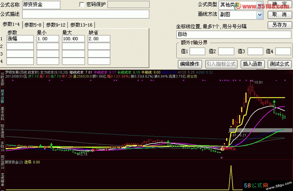 说明:又有同学要要的《就要涨停智能选股系统》“游资资金”副图源码,可配合“主力成本”主图使用。 千万不要忘了参数设置哦!!!! N1:=5;N4:=34;CQ:=100*(C-LLV(L,N4))/(HHV(C,N4)-LLV(L,N4)); SAT:=(AMOUNT/C)/(HHV(AMOUNT,N4)/HHV(C,N4));饱和度:=IF(SAT>1,1,SAT)*100;持股:=3*SMA((CLOSE-LLV(LOW,27))/(HHV(HIGH,27)-LLV(LOW,27))*100,5,1)-2*SMA(SMA((CLOSE-LLV(LOW,27))/(HHV(HIGH,27)-LLV(LOW,27))*100,5,1),3,1);支撑:=LLV(持股,3);中期线:=MA(持股,12);VAR1:=1;VAR2:=LLV(LOW,10);VAR3:=HHV(HIGH,25);短期线:=EMA((CLOSE-VAR2)/(VAR3-VAR2)*4,4)*VAR1*30;KDDD:=饱和度>=97 AND CQ>90 AND 中期线<50;KFFF:=BARSLAST(CROSS(短期线,中期线))<10;KGGG:=C/REF(C,1)>1+0.01*涨幅;进场:KDDD AND KFFF AND C>O AND KGGG,LINETHICK2,COLORYELLOW; |