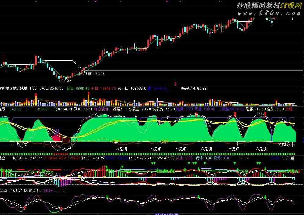 DIF:=EMA(CLOSE,20)-EMA(CLOSE,5); DEA:=EMA(DIF,10); MACD:=300*(DIF-DEA)*2/EMA(C,30); VARA:=EMA(REF(CLOSE,1),4); 青山:=(SMA(MAX(CLOSE-VARA,0),6,1)/SMA(ABS(CLOSE-VARA),6,1)*100); 绿水:=青山<3.5,COLORDBDBDB; 火红的:=FILTER(MACD<0 AND MACD>REF(MACD,1) AND 青山<20,5); 太阳:=CROSS(青山,90),COLOR00FF00; {STICKLINE(青山,0,120,4,0),COLOR8B30FF;} DD:=IF(MACD>=0,MACD,DRAWNULL)*1.5; STICKLINE(DD AND DD>REF(DD,1),0,DD*0.8,4,0),COLOR0000FF; STICKLINE(DD AND DD<REF(DD,1),0,DD*0.8,3,1),COLOR0000FF; (青山-25)*1.5,COLOR5BE000,LINETHICK6; STICKLINE((青山-25)*1.5>0,0,(青山-25)*1.5,4,0),COLOR5BE000; STICKLINE(青山,0,-50,4,0),COLORBLACK{COLORABA400}; IF(绿水,-10,DRAWNULL),CROSSDOT,CIRCLEDOT,LINETHICK1,COLOR688EC1; DRAWTEXT(CROSS( 0,MACD)AND 青山>75 OR 太阳,98,'ヲ'),COLORDBDBDB; AR1:=LLV(LOW,10); AR2:=HHV(H,25); AR3:=EMA((C-AR1)/(AR2-AR1)*4,4); STICKLINE(CROSS(AR3,0.3),-50,-30,3,0),COLORRED,LINETHICK1; STICKLINE(CROSS(3.5,AR3),100,120,2,0), COLORRED,LINETHICK2; 红红的天:=3*SMA((CLOSE-LLV(LOW,27))/(HHV(HIGH,27)-LLV(LOW,27))*100,5,1) -2*SMA(SMA((CLOSE-LLV(LOW,27))/(HHV(HIGH,27) -LLV(LOW,27))*100,5,1),3,1),LINETHICK0; IF(红红的天>10,-50,DRAWNULL),CIRCLEDOT,COLORGREEN; IF(红红的天<=10,-50,DRAWNULL),CIRCLEDOT,COLOR0000CC; L1:=(CLOSE-LLV(LOW,11))/(HHV(HIGH,11)-LLV(LOW,11))*200-60; 龙K:SMA(L1,3,1),COLORBBFFBB; 凤D:SMA(龙K,3,1),COLORBBFFBB; 有心就有:IF(CROSS(红红的天,2),-20,DRAWNULL),CROSSDOT,LINETHICK6,COLORFF33FF; 好运!:IF(CROSS(红红的天,2),-20,DRAWNULL),POINTDOT,LINETHICK4,COLOR00CCFF; VAR26:=(CLOSE-LLV(LOW,27))/(HHV(HIGH,27)-LLV(LOW,27))*100; VAR27:=REVERSE(VAR26); VAR28:=SMA(VAR26,3,1); 波段王: SMA(VAR28,3,1),LINETHICK2,COLORYELLOW ; 波段鬼: SMA(波段王,3,1),LINETHICK2 , COLORYELLOW; 地狱: IF(CROSS(波段王,波段鬼) AND 波段王<40,35,0),COLORFF0080; 天堂: IF(CROSS(波段鬼,波段王) AND 波段鬼>75,70,100),COLORFF0080; {神秘买点} SM01:=MA((2*C+H+L)/4,5); SM02:=SM01*(200-102)/100; SM03:=(1-7/100)*DMA(C,ABS((2*C+H+L)/4-MA(C,20))/MA(C,20)); SM04:=(C-LLV(L,9))/(HHV(H,9)-LLV(L,9))*100; SM05:=3*SMA(SM04,3,1)-2*SMA(SMA(SM04,3,1),3,1); SM06:=((H+L+C)/3-MA((H+L+C)/3,14))/(0.015*AVEDEV((H+L+C)/3,14)); SM07:=SM02<SM03&&SM05>REF(SM05,1)&&REF(SM05,1)<REF(SM05,2)&&SM06<-100&&SM06>REF(SM06,1); STICKLINE(SM07,0,50,0.5,0),COLORYELLOW; {神秘买点:SM07,COLORRED,LINETHICK3;}; {RSI二线差} N:=5; AA:="RSI.RSI1"(3,14,24); BB:="RSI.RSI2"(3,14,24); 二线差RSI:IF((BB-AA)/AA>N,50,0),STICK,LINETHICK2,COLORFF0080;