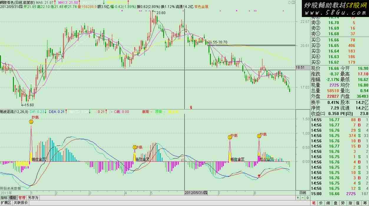 用法如下,仅供参考: 1.趋势判断用DIF和DEA,0轴相当于72天均线,DIF相当于6均线;DEA相当于10均线。 2.看柱子,0轴相当于13天均线,红柱子:股价站上10天均线,绿柱子:股价跌破10天均线。 DIF:EMA(CLOSE,12)-EMA(CLOSE,26),COLORLIBLUE;DEA:EMA(DIF,9),COLORBLUE;MACD:(DIF-DEA)*2,COLORSTICK;STICKLINE(MACD<REF(MACD,1) AND MACD>0,0,MACD,1,0),COLORLIBLUE;STICKLINE(MACD>REF(MACD,1) AND MACD<0,0,MACD,1,0),COLORFF00FF;IF(DEA<DIF,DEA,DRAWNULL),COLORRED;IF(DIF>=REF(DIF,1),DIF,DRAWNULL),COLORBLACK;C底:ABS((CROSS("MACD.DIF","MACD.DEA")&&"MACD.DEA"<=-0.07)*"MACD.DIF")*1.50,COLORLIMAGENTA; DRAWTEXT(ABS(C底)>0,C底*1.30,' 抄底'),COLORRED;DRAWICON(ABS(C底)>0,C底*1.10,4);{低位金叉,二次金叉,背离}低位金叉:=CROSS(DIF,DEA) AND DIF<-0.1; STICKLINE(低位金叉,0,0.3,2,0),COLORYELLOW; DRAWTEXT(低位金叉,0.16,' 低位金叉'),COLORBLACK; JCCOUNT:=COUNT(CROSS(DIF,DEA),BARSLAST(DEA>=0)); 二次金叉:=CROSS(DIF,DEA) AND DEA<0 AND COUNT(JCCOUNT=2,21)=1; STICKLINE(二次金叉,0,0.2,2,0),COLORFF00FF;DRAWICON(二次金叉,DEA*0.9,1) ; DRAWTEXT(二次金叉,0.2,' 二次金叉'),COLORYELLOW; A1:=BARSLAST(REF(CROSS(DIF,DEA),1)); 底背离:=REF(CLOSE,A1+1)>CLOSE AND DIF>REF(DIF,A1+1) AND CROSS(DIF,DEA); STICKLINE(底背离,0,0.1,2,0),COLOR00FF00; 底背:DRAWLINE(A1=0,DEA,底背离,DEA,0),COLORRED,LINETHICK2; DRAWTEXT(底背离,0.12,' 底背离'),COLORFF00FF; A2:=BARSLAST(REF(CROSS(DEA,DIF),1)); 顶背离:=REF(CLOSE,A2+1)<CLOSE AND REF(DIF,A2+1)> DIF AND CROSS(DEA,DIF); 顶背:DRAWLINE(A2=0,DEA,顶背离,DEA,0),COLORGREEN,LINETHICK2; DRAWTEXT(低位金叉 AND 二次金叉 AND 底背离,0.25,'三全项'),COLOR0000FF,LINETHICK2;{黄金坑}RR8:=MA(CLOSE,27);RR9:=(CLOSE-RR8)/RR8;RRA:=MA(RR9,2);RRB:=BARSLAST(CROSS(-0.1,RRA)=1);RRD:=RRA<-0.1 AND RRB>0.3; 黄金坑:IF(RRD,-0.15,DRAWNULL),COLORYELLOW,STICK,LINETHICK3;  |