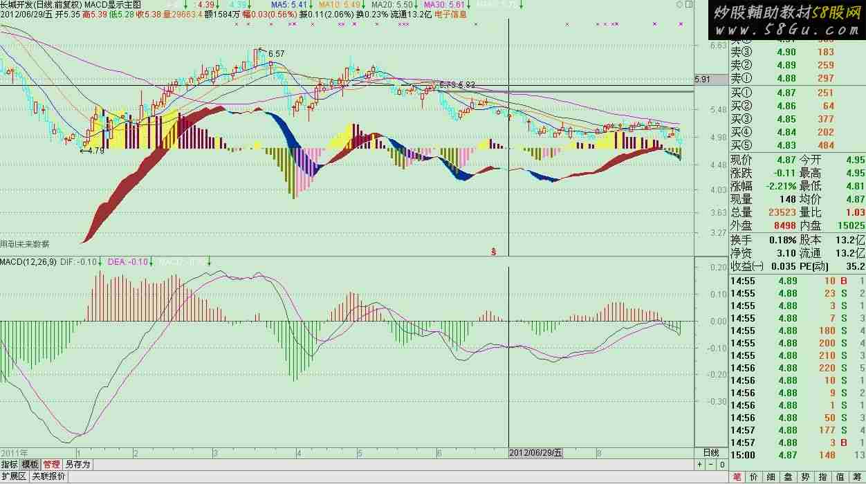 {MACD真实地显示在主图}DIFZ:=EMA(C,12)-EMA(C,26);DEAZ:=EMA(DIFZ,9);MACDZ:=8*(DIFZ-DEAZ);TYNNN:=60;A1:=REF(HIGH,TYNNN)=HHV(HIGH,2*TYNNN+1); B1:=FILTER(A1,TYNNN); C1:=BACKSET(B1,TYNNN+1); D1:=FILTER(C1,TYNNN);A2:=REF(LOW,TYNNN)=LLV(LOW,2*TYNNN+1); B2:=FILTER(A2,TYNNN); C2:=BACKSET(B2,TYNNN+1); D2:=FILTER(C2,TYNNN);E1:=(REF(LLV(LOW,2*TYNNN),1)+REF(HHV(HIGH,2*TYNNN),1))/2; E2:=(HIGH+LOW)/2;H1:=(D1 AND NOT(D2 AND E1>=E2)) OR ISLASTBAR OR BARSCOUNT(CLOSE)=1;L1:=(D2 AND NOT(D1 AND E1<E2)); X1:=REF(BARSLAST(H1),1)+1; F1:=BACKSET(H1 AND COUNT(L1,X1)>0,LLVBARS(IF(L1,LOW,10000),X1));G1:=F1>REF(F1,1); I1:=BACKSET(G1,2); LD:=I1>REF(I1,1);UU:=BACKSET(ISLASTBAR,BARSLAST(LD)+1);VV:=UU>REF(UU,1);RCC:=REF(L,BARSLAST(VV));DRAWBAND(DIFZ*4+RCC,RGB(155,50,50),EMA(DIFZ*4+RCC,9),RGB(0,50,150));{此句4.0以下版本要删除}STICKLINE((RCC+MACDZ)>RCC AND (RCC+MACDZ)<=REF(RCC+MACDZ,1),RCC,RCC+MACDZ,1,0),COLOR400080;STICKLINE((RCC+MACDZ)>RCC AND (RCC+MACDZ)>REF(RCC+MACDZ,1),RCC,RCC+MACDZ,1,0),COLOR00FFFF;STICKLINE((RCC+MACDZ)<=RCC AND (RCC+MACDZ)<=REF(RCC+MACDZ,1),RCC,RCC+MACDZ,1,0),COLOR008080;STICKLINE((RCC+MACDZ)<=RCC AND (RCC+MACDZ)>REF(RCC+MACDZ,1),RCC,RCC+MACDZ,1,0),COLORC080FF;IF(C,EMA(DIFZ*4+RCC,9),DRAWNULL),COLORFFFFFF,LINETHICK1;IF(C,DIFZ*4+RCC,DRAWNULL),COLORRED,LINETHICK1;IF(DIFZ<=REF(DIFZ,1),DIFZ*4+RCC,DRAWNULL),COLORFFF000;STICKLINE(C>O,H,L,0,0),COLORRED;STICKLINE(C>O,C,O,3.1,1),COLORRED;STICKLINE(C<=O,H,L,0,0),COLORCYAN;STICKLINE(C<=O,C,O,3.1,1),COLORCYAN;{均线状态}MA5:MA(C,5);MA10:MA(C,10);MA20:MA(C,20);MA30:MA(C,30);MA60:MA(C,60);UploadPic/2012-9/2012921551217787.jpg |