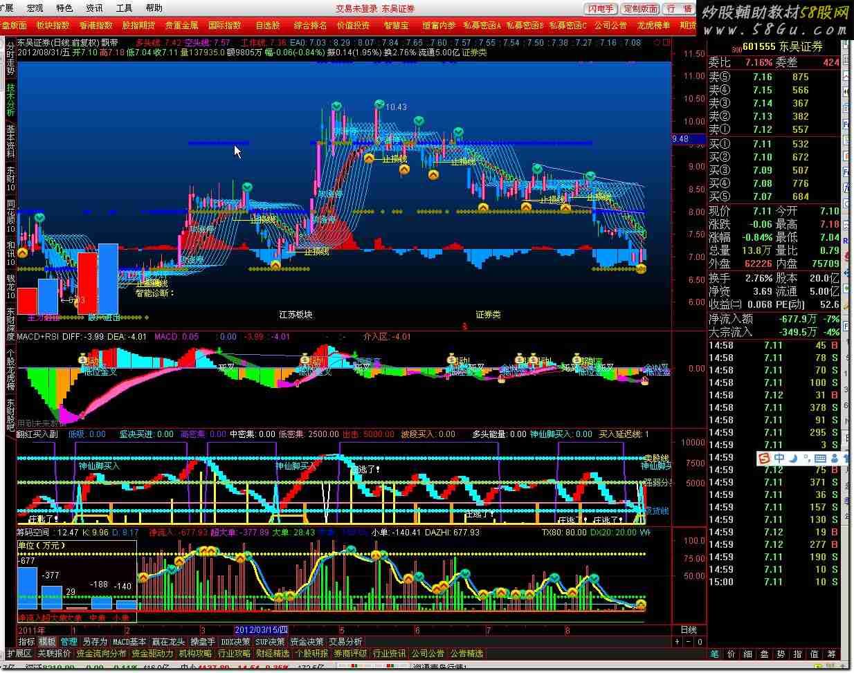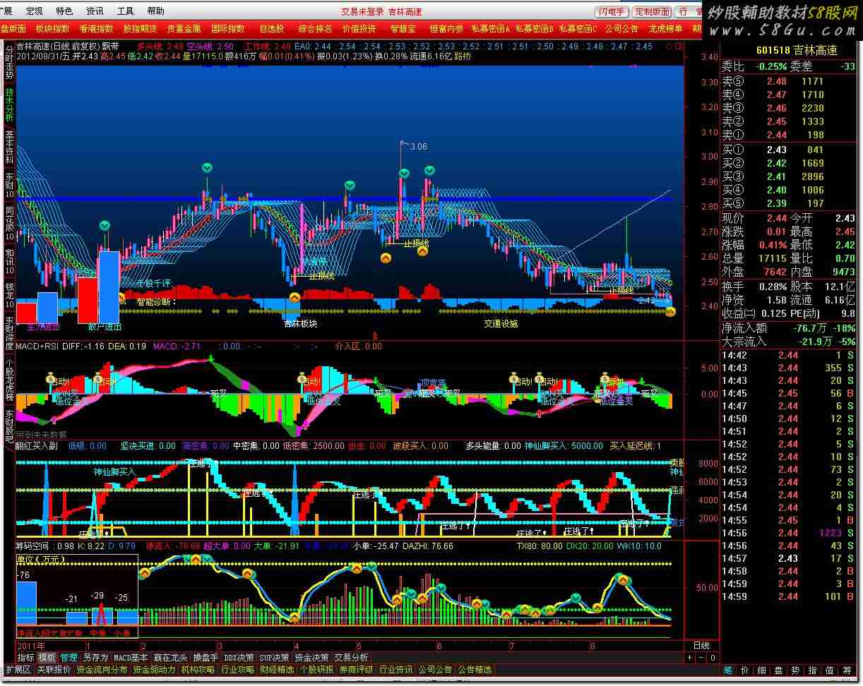 {MACD+RSI} LC:=REF(CLOSE,1); RSI:=SMA(MAX(CLOSE-LC,0),12,1)/SMA(ABS(CLOSE-LC),12,1)*100; RSIE:=EMA(RSI,3); DIFF : EMA(RSIE,12) - EMA(RSIE,26); BBDIFF:=DIFF-REF(DIFF,1); DEA : EMA(DIFF,9); DRAWBAND(DIFF,RGB(255,105,180),DEA,RGB(34,139,34)); BBDEA:=DEA-REF(DEA,1); MACD : 2*(DIFF-DEA), COLORSTICK; STICKLINE(MACD<REF(MACD,1)AND MACD>0,0,MACD,2,0),COLORFFFF00; STICKLINE(MACD<REF(MACD,1)AND MACD<0,0,MACD,2,0),COLOR00FF00; STICKLINE(MACD>REF(MACD,1)AND MACD<0,0,MACD,2,0),COLOR0099FF; STICKLINE(MACD>REF(MACD,1)AND MACD>0,0,MACD,2,0),COLORRED; 0,COLORFF8855,LINETHICK2; IF(DIFF>DEA,DIFF,DRAWNULL),COLORRED,LINETHICK2; IF(DEA>REF(DEA,1),DEA,DRAWNULL),COLORMAGENTA; DRAWICON(CROSS(DIFF,DEA),DEA,1); DRAWICON(CROSS(DEA,DIFF),DEA,2); 低位金叉:=CROSS(DIFF,DEA) AND DIFF<-0.1; STICKLINE(低位金叉,0,-1.5,2,0),COLORFFFF00; DRAWTEXT(低位金叉,-1.5,' 低位金叉'),COLORFFFF00; JCCOUNT:=COUNT(CROSS(DIFF,DEA),BARSLAST(DEA>=0)); 二次金叉:=CROSS(DIFF,DEA) AND DEA<0 AND COUNT(JCCOUNT=2,21)=1; STICKLINE(二次金叉,0,-1,5,0),COLORFF00FF; DRAWICON(二次金叉,DEA*1.2,11) ; DRAWTEXT(二次金叉,-1,' 二次金叉'),COLORFF00FF; A1:=BARSLAST(REF(CROSS(DIFF,DEA),1)); 底背离:=REF(CLOSE,A1+1)>CLOSE AND DIFF>REF(DIFF,A1+1) AND CROSS(DIFF,DEA); STICKLINE(底背离,0,1.5,3,0),COLOR00FF00; DRAWLINE(A1=0,DEA,底背离,DEA,0),COLORRED,LINETHICK1; DRAWTEXT(底背离,2,' 底背离'),COLOR00FF00; A2:=BARSLAST(REF(CROSS(DEA,DIFF),1)); 顶背离:=REF(CLOSE,A2+1)<CLOSE AND REF(DIFF,A2+1)>DIFF AND CROSS(DEA,DIFF); STICKLINE(顶背离,0,2,3,0),COLORFF8855; DRAWLINE(A2=0,DEA,顶背离,DEA,0),COLORFF8855,LINETHICK1; DRAWTEXT(顶背离,2,' 顶背离'),COLORFF8855; VAR9:=((CLOSE-LLV(LOW,27))/(HHV(HIGH,27)-LLV(LOW,27)))*(100); VAR10:=SMA(VAR9,3,1); VAR11:=SMA(VAR10,3,1); VAR12:=SMA(VAR11,3,1); DRAWTEXT(CROSS(VAR11,VAR12) AND (VAR11<40),2.3,'启动!'),COLORYELLOW; STICKLINE(CROSS(VAR11,VAR12) AND (VAR11<40),0,2,1.5,0 ),COLORCYAN; 主力出现:DRAWICON(CROSS(VAR11,VAR12) AND (VAR11<40),3.0,9); MM:=IF(MACD< 0,MACD,0); JJ1:=MM> REF(MM,1); ZZ:=REF(JJ1,1)=1; 介入区:(JJ1 AND ZZ)*DEA,POINTDOT,COLOR0066FF;{MACD蓝柱缩短---指今日比昨天短} STICKLINE(介入区=DEA,DEA,DIFF,3,0),COLORMAGENTA; DRAWTEXT(CROSS(DIFF,DEA ),-0.05,'金\N叉'),COLORCYAN; DRAWTEXT(CROSS(DEA,DIFF ),-0.05,'死叉'),COLORWHITE;  |
