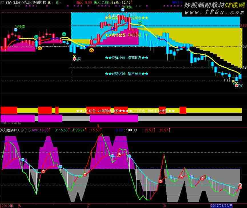 A4:=MA(CLOSE,20); A5:=(CLOSE>MA(CLOSE,5)); A6:=(MA(CLOSE,5)>MA(CLOSE,10)); A7:=(CLOSE>MA(CLOSE,10)); A8:=(MA(CLOSE,5)>MA(CLOSE,20)); A9:=(CLOSE>MA(CLOSE,20)); A10:=REF(A4,1); A11:=(A4> A10); AVX:(((((IF(A5,10,(0 - 10)) + IF(A6,10,(0 - 10))) + IF(A7,10,(0 -10))) + IF(A8,10,(0 - 10))) + IF(A9,10,(0 - 10))) + IF(A11,10,(0 -10)))+50,COLORFF00FF; DRAWBAND(AVX,RGB(180,0,180),50,RGB(130,130,130)); RSV:=(CLOSE-LLV(LOW,9))/(HHV(HIGH,9)-LLV(LOW,9))*100; K:=SMA(RSV,31,1); D:SMA(K,3,1),COLORFFFF00,LINETHICK2; J:3*K-2*D,COLOR00FF00,LINETHICK2; IF(D>=REF(D,1),D,DRAWNULL),COLOR0000FF,LINETHICK2; STICKLINE(D>=REF(D,1) AND J>=REF(J,1),J,D,0,0),COLORRED; STICKLINE(D>=REF(D,1) AND J<REF(J,1),J,D,0,0),COLOR00FF00; STICKLINE(D<=REF(D,1) AND J>=REF(J,1),J,D,0,0),COLORFF00FF; STICKLINE(D<=REF(D,1) AND J<REF(J,1),J,D,0,0),COLORFFFFFF; DRAWICON(CROSS(K,D),D,13); DRAWICON(CROSS(D,K),D,14); DRAWICON(CROSS(K,D) AND K<=20,20,23); 0;100; STICKLINE(1,20,20,2,0),COLORFFFF00; STICKLINE(1,80,80,2,0),COLOR00FF00; STICKLINE(1,50,50,2,0),COLORFF0000; IF(D>=REF(D,1),D,DRAWNULL),COLOR0000FF,LINETHICK2; IF(J>=REF(J,1),J,DRAWNULL),COLOR0000FF,LINETHICK2; |
