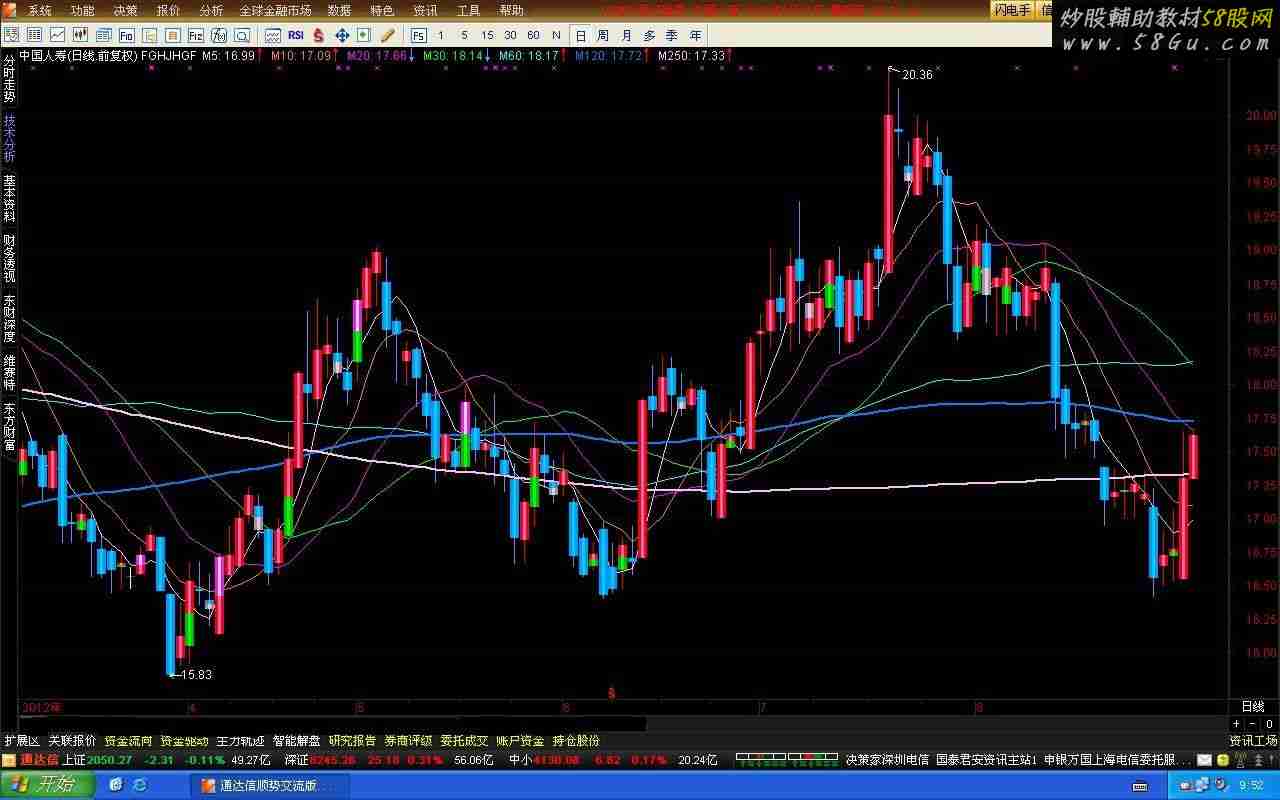 M5:MA(CLOSE,5); M10:MA(CLOSE,10); M20:MA(CLOSE,20); M30:MA(CLOSE,30); M60:MA(CLOSE,60); M120:MA(CLOSE,120)COLORFF7F00,LINETHICK2; M250:MA(CLOSE,250)LINETHICK2; VAR1:=C=HHV(C,4) AND REF(C,1)=LLV(C,4); VAR2:=C=LLV(C,4) AND (REF(C,1)<REF(C,2) OR REF(C,1)<REF(C,3)) OR REF(C,1)=LLV(C,4) AND C<REF(C,2) OR REF(C,2)=LLV(C,4) AND REF(C,1)=HHV(C,4) AND C<REF(C,1) OR REF(C,3)=LLV(C,4) AND C<REF(C,1) AND C<REF(C,2); VAR3:=REF(C,1)=LLV(C,4) AND C>=REF(C,2) OR REF(C,2)=LLV(C,4) AND REF(C,1)<=REF(C,3) AND REF(C,2)<REF(C,4) AND C>=REF(C,1); A:=(3*C+L+O+H)/6; VAR4:=(20*A+19*REF(A,1)+18*REF(A,2)+17*REF(A,3)+16*REF(A,4)+15*REF(A,5)+ 14*REF(A,6)+13*REF(A,7)+12*REF(A,8)+11*REF(A,9)+10*REF(A,10)+9*REF(A,11)+8*REF(A,12) +7*REF(A,13)+6*REF(A,14)+5*REF(A,15)+4*REF(A,16)+3*REF(A,17)+2*REF(A,18)+REF(A,20))/210; MTM:=C-REF(C,1); DX:=100*EMA(EMA(MTM,6),6)/EMA(EMA(ABS(MTM),6),6); CB:=EMA(VAR4,13); {红} STICKLINE(CLOSE>=OPEN,CLOSE,OPEN,3,0),COLOR0000FF; STICKLINE(CLOSE>=OPEN,CLOSE,OPEN,0.5,0),COLORCC66FF; {蓝} STICKLINE(CLOSE<OPEN,CLOSE,OPEN,3,0),COLORFF9900; STICKLINE(CLOSE<OPEN,CLOSE,OPEN,0.5,0),COLORFFCC00; {粉} STICKLINE(VAR1,C,(O+C)/2,3,0),COLORFF11FF; STICKLINE(VAR1,C,(O+C)/2,0.5,0),COLORFFDDFF; {灰} STICKLINE(VAR2,C,(O+C)/2,3,0),COLOR999999; STICKLINE(VAR2,C,(O+C)/2,0.5,0),COLORFFBBFF; {绿} STICKLINE(VAR3,O,(O+C)/2,3,0),COLOR00BB00; STICKLINE(VAR3,O,(O+C)/2,0.5,0),COLOR00FF00; |