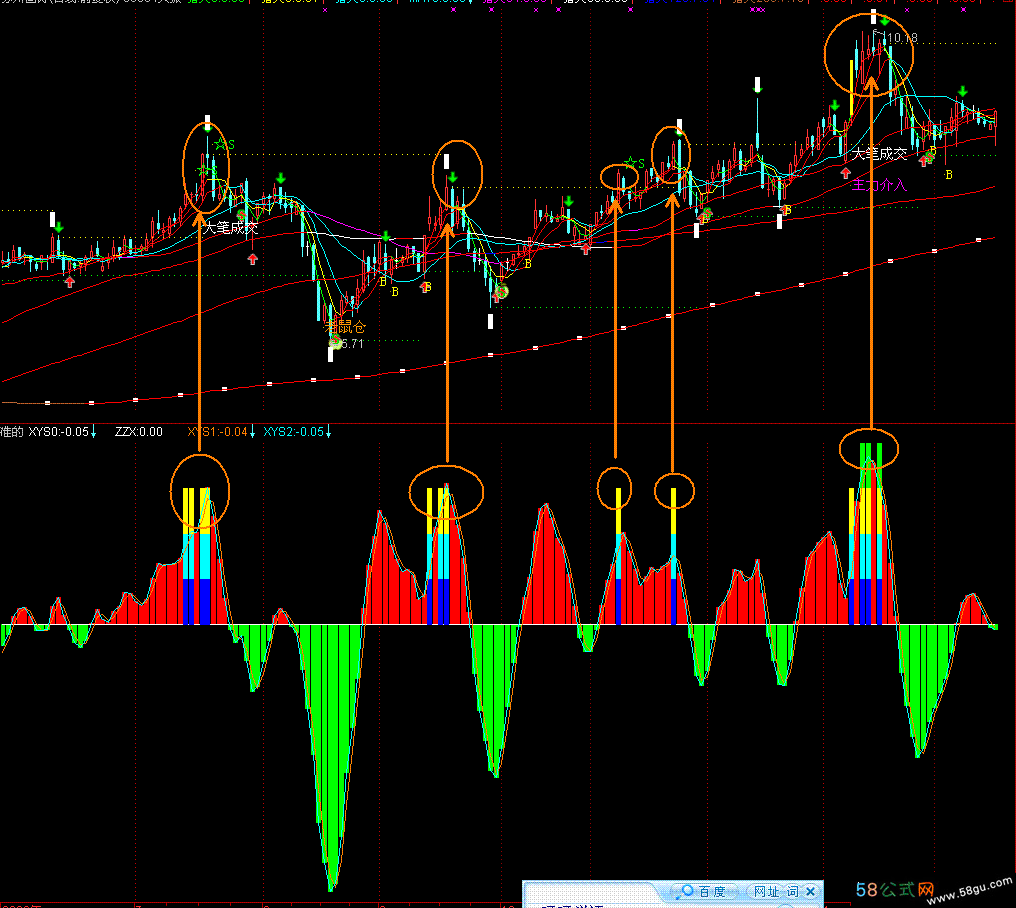 WY1001:=(2*CLOSE+HIGH+LOW)/4; WY1002:=EMA(WY1001,4); WY1003:=EMA(WY1002,4); WY1004:=EMA(WY1003,4); XYS0:(WY1004-REF(WY1004,1))/REF(WY1004,1)*100; STICKLINE(XYS0>=0,XYS0,0,2,0),COLORRED; STICKLINE(XYS0<0,XYS0,0,2,0),COLORGREEN; PJGJ:=AMOUNT/VOL/100; SSRYDJX:=MA(PJGJ,13); SSRCJL:=EMA(VOL,13); SSRCJE:=EMA(AMOUNT,13); SSRCBJX:=SSRCJE/SSRCJL/100; CYS13:=(CLOSE-SSRCBJX)/SSRCBJX*100; XYSHSL:=EMA(VOL/CAPITAL*100,13); ZZX:0,COLORWHITE; STICKLINE(XYSHSL>6.1 AND CYS13>5 ,2 ,0 ,2 ,0 ),COLORGREEN; STICKLINE(XYSHSL>3.8 AND CYS13>5 ,1.5 ,0 ,2 ,0 ),COLORYELLOW; STICKLINE(XYSHSL>2.1 AND CYS13>5 ,1 ,0 ,2 ,0 ),COLORCYAN; STICKLINE(XYSHSL>1.8 AND CYS13>5 ,0.5 ,0 ,2 ,0 ),COLORBLUE; XYS1:MA(XYS0,2); XYS2:MA(XYS0,1); |