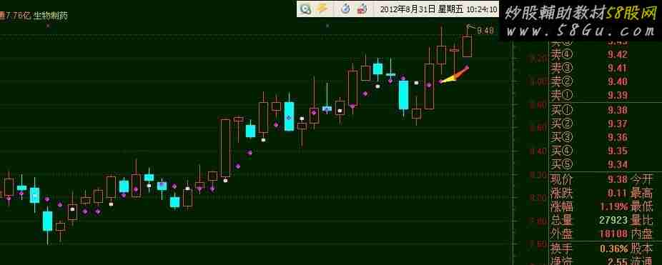 DRAWTEXT(【0】<【4】 AND 【1】>【3】,【2】,'转弱'),COLOR33FFCC;