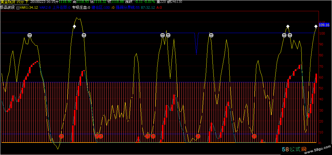 VAR1:4*SMA((CLOSE-LLV(LOW,9))/(HHV(HIGH,9)-LLV(LOW,9))*100,5,1)- 3*SMA(SMA((CLOSE-LLV(LOW,9))/(HHV(HIGH,9)-LLV(LOW,9))*100,5,1),3.2,1), COLORYELLOW,LINETHICK1; VAR2:8,COLORBLUE; 上升在即: IF(CROSS(VAR1,VAR2),50,0),STICK,COLOR0000CC,LINETHICK2; 专吸庄血: IF(VAR1<=8,25,0),STICK,COLORWHITE,LINETHICK2; DRAWICON(CROSS(VAR1,VAR2),8,1); VARO5:=LLV(LOW,27); VARO6:=HHV(HIGH,34); VARO7:=EMA((CLOSE-VARO5)/(VARO6-VARO5)*4,4)*25; 建仓区: IF((VARO7<10),80,100) ,COLORBLUE; 0,LINETHICK2 ,COLORFFCC00; DRAWICON(CROSS(100,VAR1),100,2); DRAWICON((100-VAR1<3 AND 100-VAR1>0),100,2); 强弱分界线:55,LINESTICK,COLORBLUE; DRAWTEXT(CROSS(VAR1,104),104,'◆'),COLORWHITE; B1:=(HHV(H,9)-C)/(HHV(H,9)-LLV(LOW,9))*100- 70; B2:=SMA(B1,9,1)+100; B3:=(C-LLV(L,9))/(HHV(H,9)- LLV(L,9))*100; B4:=SMA(B3,3,1); B5:=SMA(B4,3,1)+100; B6:=B5-B2; B7:IF(B6>60,B6-60,0); 持有:STICKLINE(REF(B7,1)<B7,B7,REF(B7,1),5,0),COLORRED; A:0,POINTDOT,COLORRED,LINETHICK3; |
