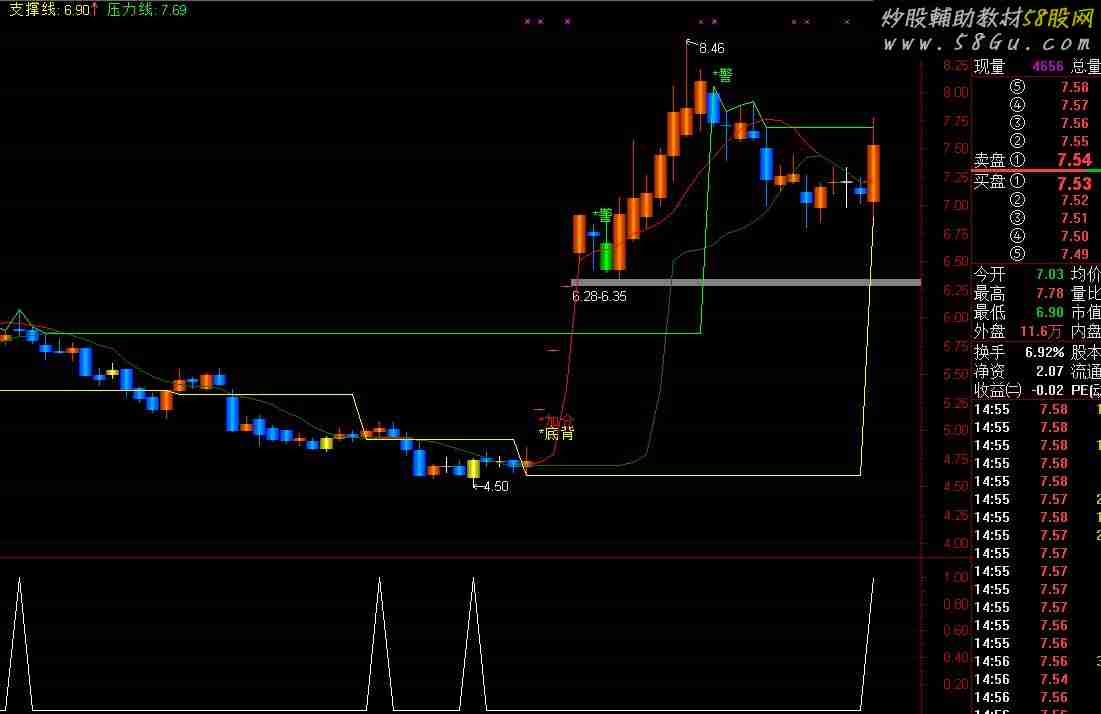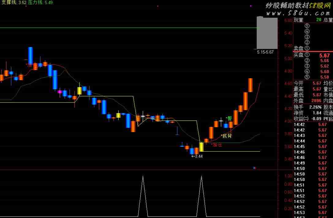 操作说明;在实战操作中,应当建立一种中线思维,短线的波动可以忽略不计。只在阶段性底部买入,阶段性顶部卖出。最好以周K线为参考依据,当大盘或个股KD指标、RSI指标均在20以下, 大多数参与者被套,舆论普遍看空,认为还要跌到XX点,这就是底部,你就坚决买入。当大盘或个股KD指标、RSI指标均在80以上,舆论普遍看多,声称要涨到XX点,大牛市之声不绝于耳, 这就是顶部,你就应该冷静卖出。 历史反复证明,市场80%的参与者总是在低位看空,在高位看多,这也是一种28定律。没有百分之百的公式,决策对与否在于自己的判断能力和实战操盘经验【仅供参考】 VAR1:=(2*CLOSE+HIGH+LOW)/4; VAR2:=LLV(LOW,34); VAR3:=HHV(HIGH,34); AA:=EMA((VAR1-VAR2)/(VAR3-VAR2)*100,13); BB:=EMA(0.667*REF(AA,1)+0.333*AA,2); XG:CROSS(AA,BB);