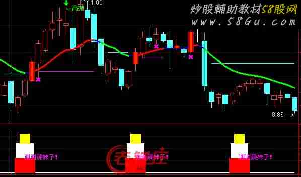 RSV:=(CLOSE-LLV(LOW,9))/(HHV(HIGH,9)-LLV(LOW,9))*100; K:=SMA(RSV,3,1); D:=SMA(K,3,1); J:=3*K-2*D; J1:=REVERSE(J); AA:=REF(MA(C,1),10)>REF(MA(C,60),10);买点:CROSS(J,J1) AND AA; STICKLINE(买点,0,30,12,0),COLOR0000FF; STICKLINE(买点,30,60,10,0),COLORWHITE; STICKLINE(买点,60,80,6,0),COLORYELLOW; DRAWTEXT(买点,40,'辣妹子!'),COLORFF00FF: