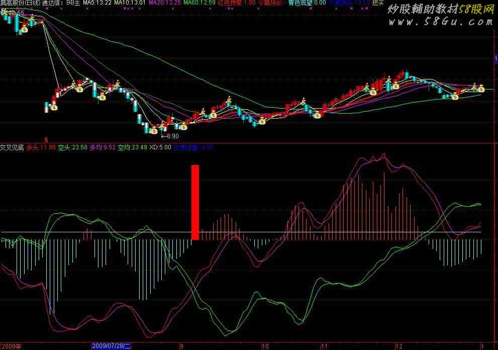 XX:=((((CLOSE - MA(CLOSE,34)) / MA(CLOSE,34)) * 100)* 5); B001:=(((((CLOSE - MA(CLOSE,42)) / MA(CLOSE,42)) ) * 100) * 5); B002:=(((((CLOSE - MA(CLOSE,67)) / MA(CLOSE,67)) ) * 100) * 5); B003:=(((XX + B001) / 2) - (B002 )); B004:=(((0 - 100) * (HHV(HIGH,34) - CLOSE)) / (HHV(HIGH,34) - LLV(LOW,34))); B005:=(((0 - 100) * (HHV(HIGH,42) - CLOSE)) / (HHV(HIGH,42) - LLV(LOW,42))); B006:=(((0 - 100) * (HHV(HIGH,72) - CLOSE)) / (HHV(HIGH,72) - LLV(LOW,72))); B007:=EMA((((B004 + B005) / 2) - B006),6); B008:=REF(CLOSE,1); B009:=((((SMA(MAX((CLOSE - B008),0),19,1) / SMA(ABS((CLOSE - B008)),19,1)) * 100) - 50) * 1.25); B010:=((((SMA(MAX((CLOSE - B008),0),34,1) / SMA(ABS((CLOSE - B008)),34,1)) * 100) - 50) * 1.25); B011:=((((SMA(MAX((CLOSE - B008),0),72,1) / SMA(ABS((CLOSE - B008)),72,1)) * 100) - 50) * 1.25); B012:=EMA(((((B009 + B010) / 2) - B011) * 5),6); B013:=((((0 - 1) * ((B007 + B003) + B012)) / 3) * 1.5); B014:=B012; B015:=B013; B016:=EMA(B012,4); B017:=B012; KKM1:=B013; DPM1:=EMA(B013,4); 多头:B017,COLOR0000FF; 空头:KKM1,COLOR00FF00; 多均:B016; 空均:DPM1; B018:=IF(CROSS(B017,KKM1),28,0); XD:5 ; VARX:=B017; C023:=KKM1; C024:=B016; C025:=DPM1; C026:=WINNER(CLOSE); W:=(DMA(C026,((VOL / CAPITAL) * 1)) * 100); HWXWINNER:=W; XD1:=EMA(W,6); XWXMH:=XD1; XD2:=MA(W,14); 庄家控盘:((HWXWINNER - XWXMH) * 10),COLORSTICK,LINETHICK2; STICKLINE(CROSS(多头,空均),0,50,8,0) ,COLORRED;