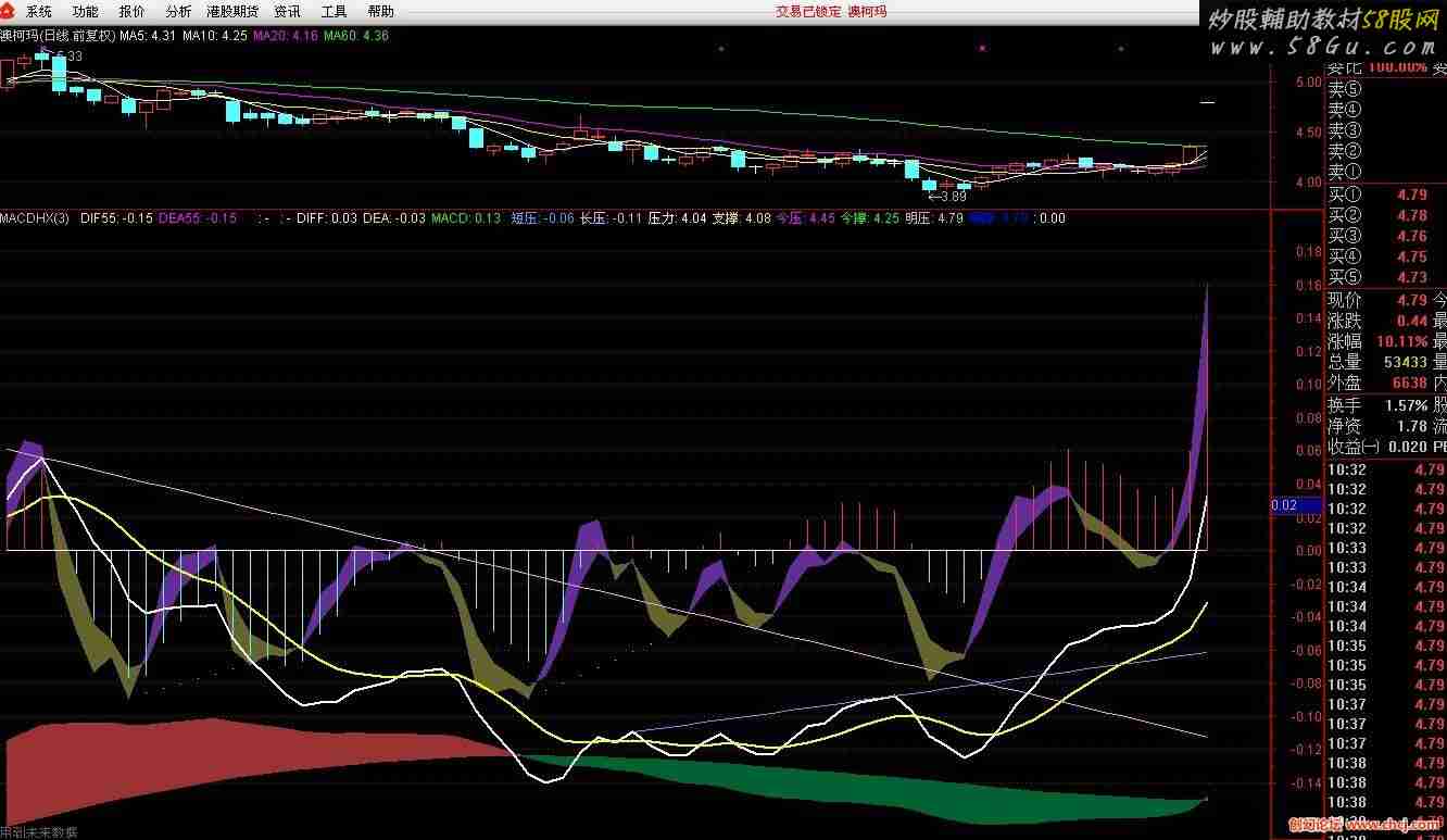 DIFF1:=EMA(CLOSE,12) - EMA(CLOSE,26); DEA1:=EMA(DIFF1,9); VARX2:=LLV(DEA1,43); VARX3:=DEA1-(DIFF1-DEA1); 低点线:=IF(DIFF1<VARX2 AND DEA1=VARX2,MIN(HHV(VARX2,10),VARX3),VARX2); VL:=REF(LOW,1); VAR12:=(SMA(ABS(LOW-VL),13,1))/(SMA(MAX(LOW-VL,0),13,1))*100; VAR14:=MA(VAR12,13); VAR15:=LLV(LOW,34); VAR18:=EMA(IF(LOW<=VAR15,VAR14,0),3); VAR110:=SMA(SMA((CLOSE-LLV(LOW,55))/(HHV(HIGH,55)-LLV(LOW,55))*100,7,1),5,1); VAR111:=SMA((CLOSE-LLV(LOW,55))/(HHV(HIGH,55)-LLV(LOW,55))*100,8,1)*15-VAR110*10.38; T:=FILTER(IF(VAR111<=VAR110 AND VAR18>0,VAR18*8,0),5); 止跌:DRAWTEXT(T AND DIFF1<低点线,DIFF1*1.01,'止跌'),COLORYELLOW; {大周期} DIF55:(EMA(CLOSE,55)-EMA(CLOSE,119))*0.55; DEA55:(EMA(DIF55,41)); DRAWBAND(DEA55,RGB(0,100,50),DIF55,RGB(155,50,50)); {小周期} DIF3_6.5F:=(EMA(CLOSE,3)-(EMA(CLOSE,6)+EMA(CLOSE,7))/2); DEA3_6.5F:=(EMA(DIF3_6.5F,3)+EMA(DIF3_6.5,2)); DRAWBAND(DEA3_6.5F,RGB(100,100,300),DIF3_6.5F,RGB(100,300,150)); AA:=REF(DIF3_6.5F,N)=HHV(DIF3_6.5F,2*N+1); BB:=BACKSET(AA,N+1); CC:=FILTER(BB,N) AND DIF3_6.5F=HHV(DIF3_6.5F,N+1); A1:=BARSLAST(REF(CC,1)); 顶背离:=REF(CLOSE,A1+1)<CLOSE AND REF(DIF3_6.5F,A1+1)>DIF3_6.5F AND CC; DRAWTEXT(顶背离,DIF3_6.5F*1.2,'顶背离'),COLORGREEN; DRAWLINE(CC,DIF3_6.5F,FILTER(顶背离>0,5),DIF3_6.5F,0),COLORWHITE,POINTDOT; AA2:=REF(DIF3_6.5F,N)=LLV(DIF3_6.5F,2*N+1); BB2:=BACKSET(AA2,N+1); CC2:=FILTER(BB2,N) AND DIF3_6.5F=LLV(DIF3_6.5F,N+1); A2:=BARSLAST(REF(CC2,1)); 底背离:=REF(CLOSE,A2+1)>CLOSE AND REF(DIF3_6.5F,A2+1)<DIF3_6.5F AND CC2; DRAWTEXT(底背离,DIF3_6.5F*1.2,'底背离'),COLORMAGENTA; DRAWLINE(CC2,DIF3_6.5F,FILTER(底背离>0,5),DIF3_6.5F,0),COLORWHITE,POINTDOT; {中周期} DIFF: EMA(CLOSE,12) - EMA(CLOSE,26),COLORWHITE,LINETHICK2; DEA:EMA(DIFF,9),COLORYELLOW,LINETHICK2; MACD: 2*(DIFF-DEA),COLORSTICK; {形态} A:=IF(CROSS(0,DEA),1,0); A11:=IF(DIFF<0 AND CROSS(DIFF,DEA),1,0); SS:=IF(A,SUM(A11,0),0); SSB:=HHV(SS,0); SSS:=SUM(A11,0); W底:=SSS-SSB=2 AND SSS>REF(SSS,1); DRAWTEXT(W底,DIFF,'↖W底'),COLORYELLOW; {画趋势线}