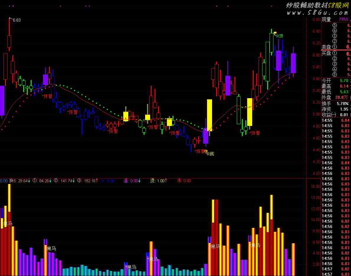 操作技巧;{蓝K持币} {红K持股} {紫K买进} {黄K加码} {绿K洗盘}